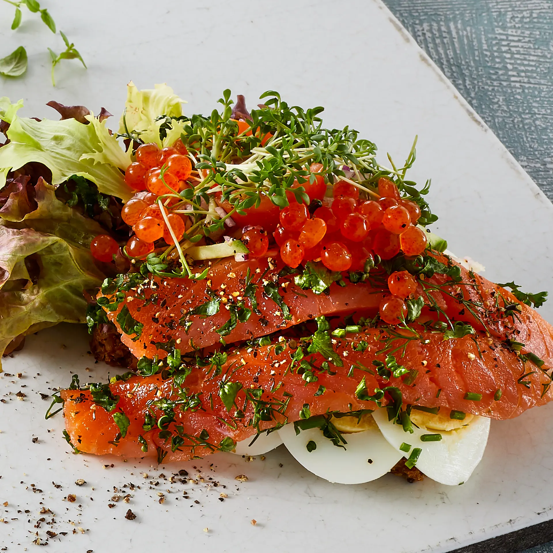 Læs opskrift : Rimmet laks rullet i peber og krydderurter på duet af æg og kartofler med rødløgssalat
