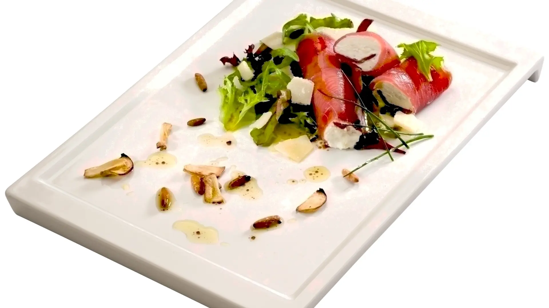 Rucolaen renses og fordeles på ti tallerkner. To tunroulader kommes på hver anretning, der pyntes med flager af fast ost, bagte hvidløg og ristede pinjekerner.