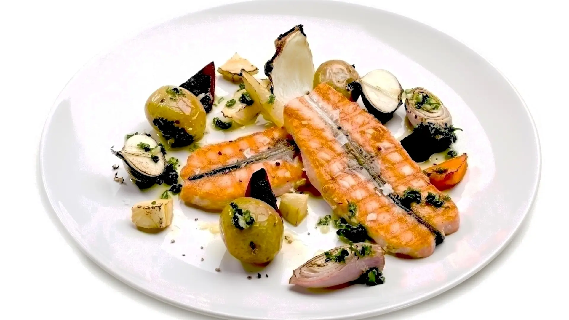 Grillet laksesteak med bagte grønsager i hvidvinsolie