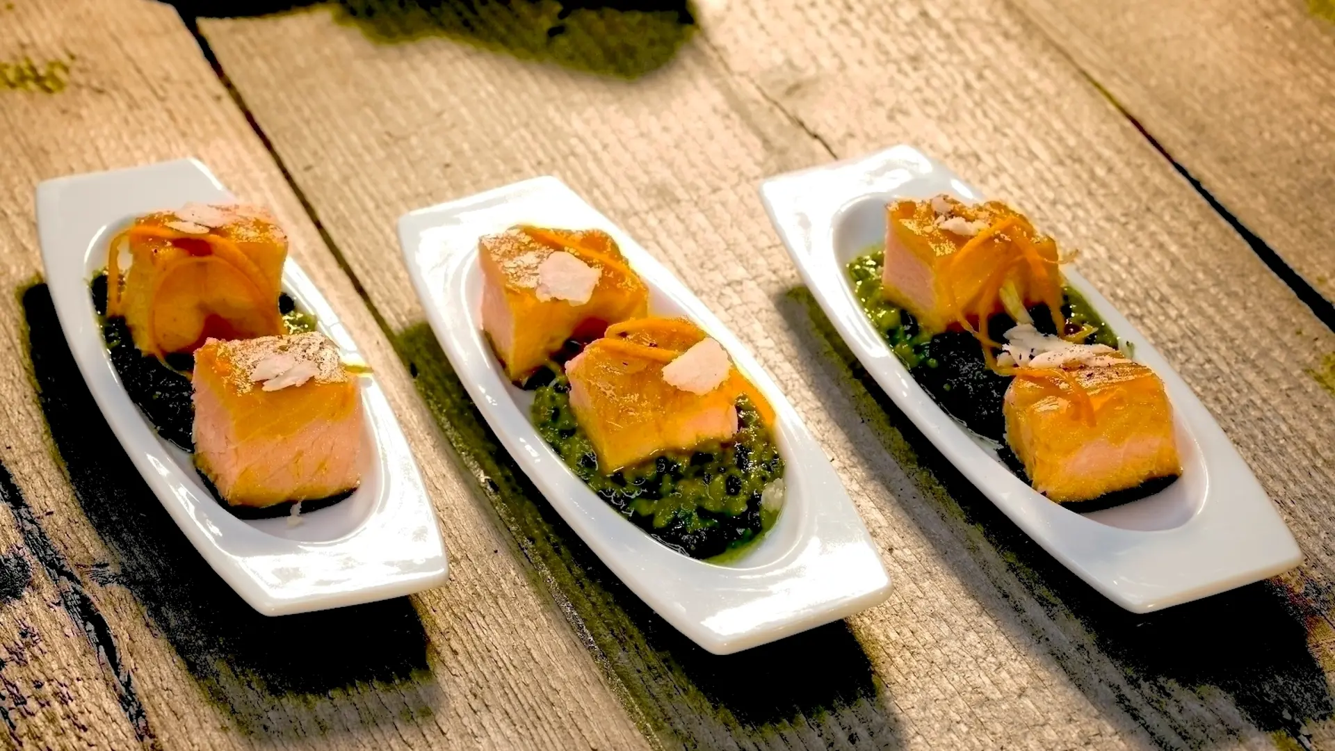 Grove tern af varmrøget laks på pesto af valnødder, rucola og appelsinsaft