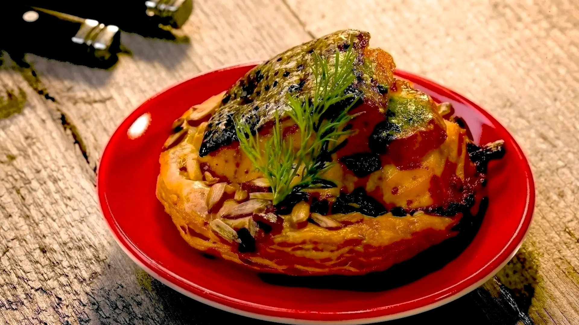 Kammuslingerne deles så der bliver to runde skiver af hver. Laksefileten skæres i grove tern. I hver tern skæres en lomme, hvor der lægges en halv hammusling. Fiskestykkerne lægges på butterdejsskiven, der bages.