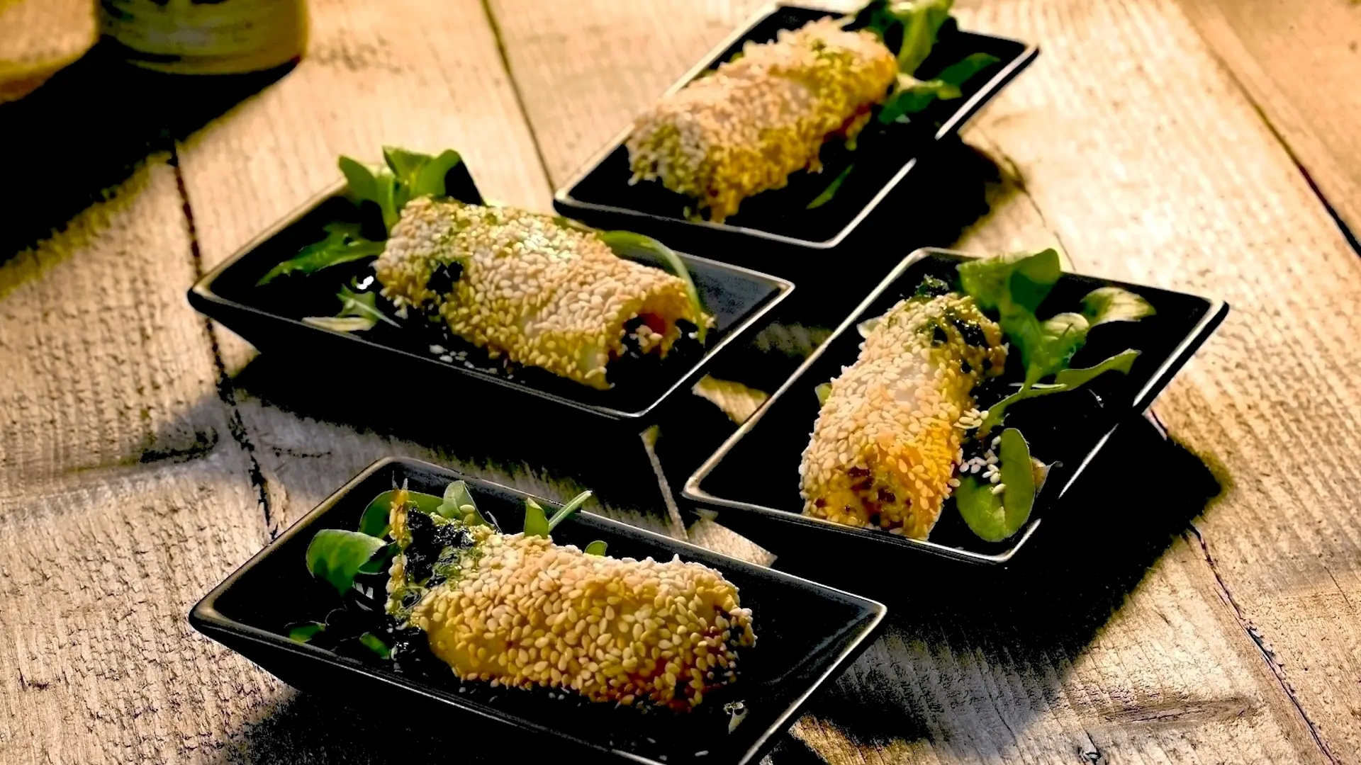 Cremen smøres på skiverne af røget hellefisk, der rulles til en lille roulade, som vendes i ristet sesam.