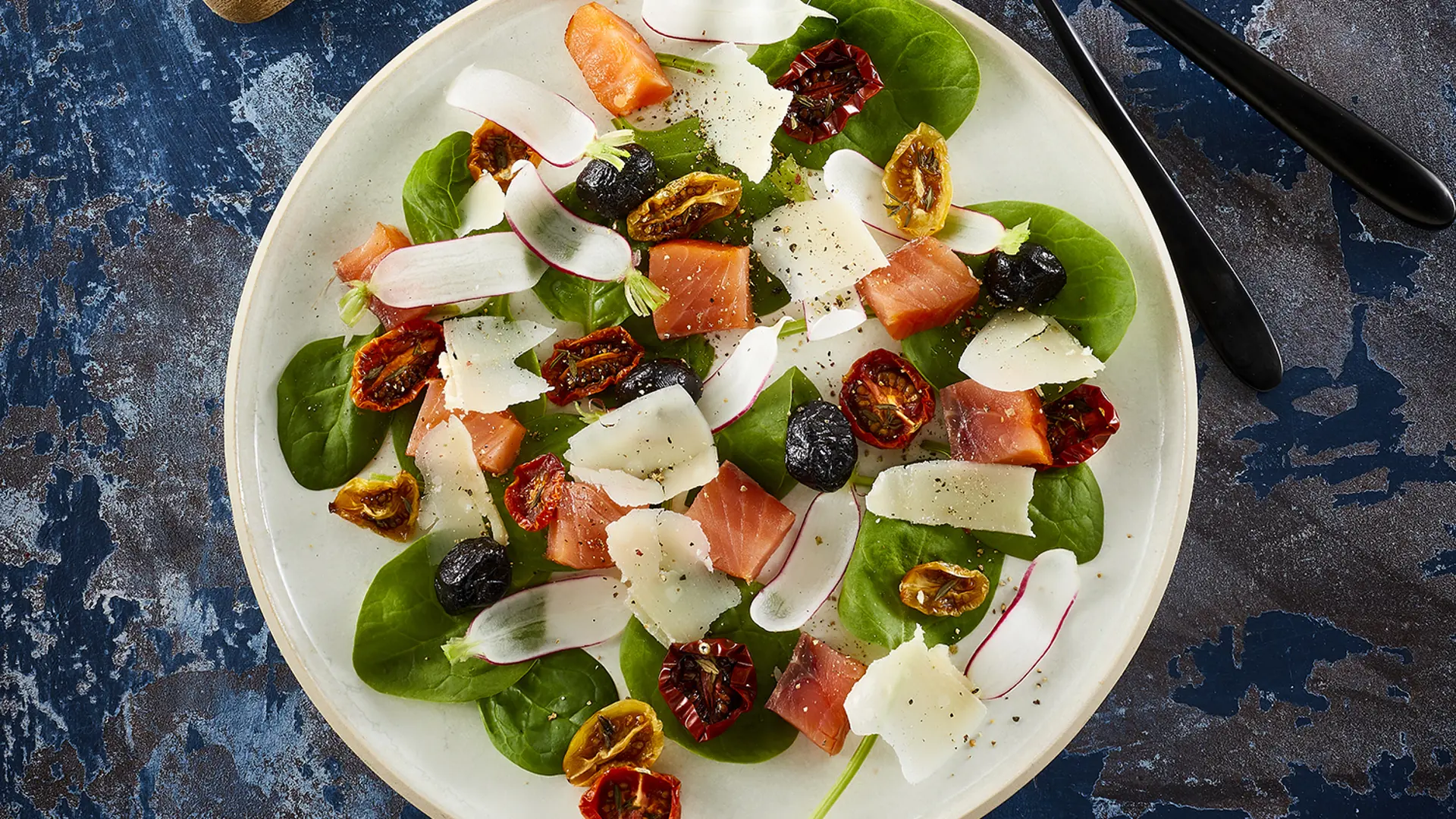 Koldrøgede laksetern på salat af spinat, radiser, tomat, osteflager og soltørrede oliven