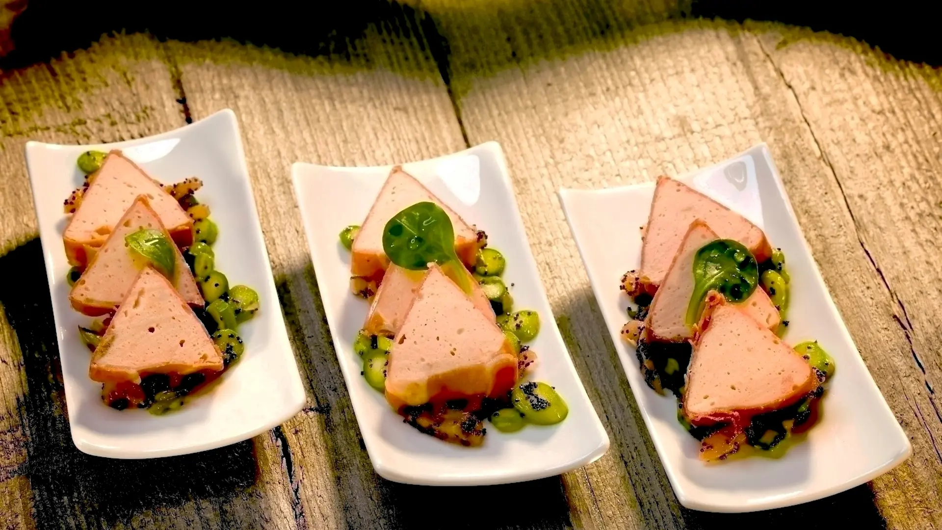 Laksepostej svøbt i spegeskinke på leje af røget laks og grønne asparges