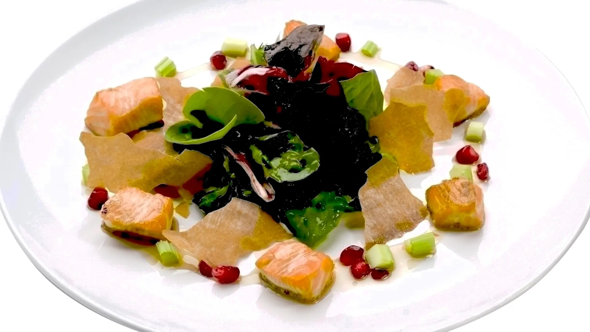 Laksesalat med granatæbler, selleri, kommendip og sprød knust dej