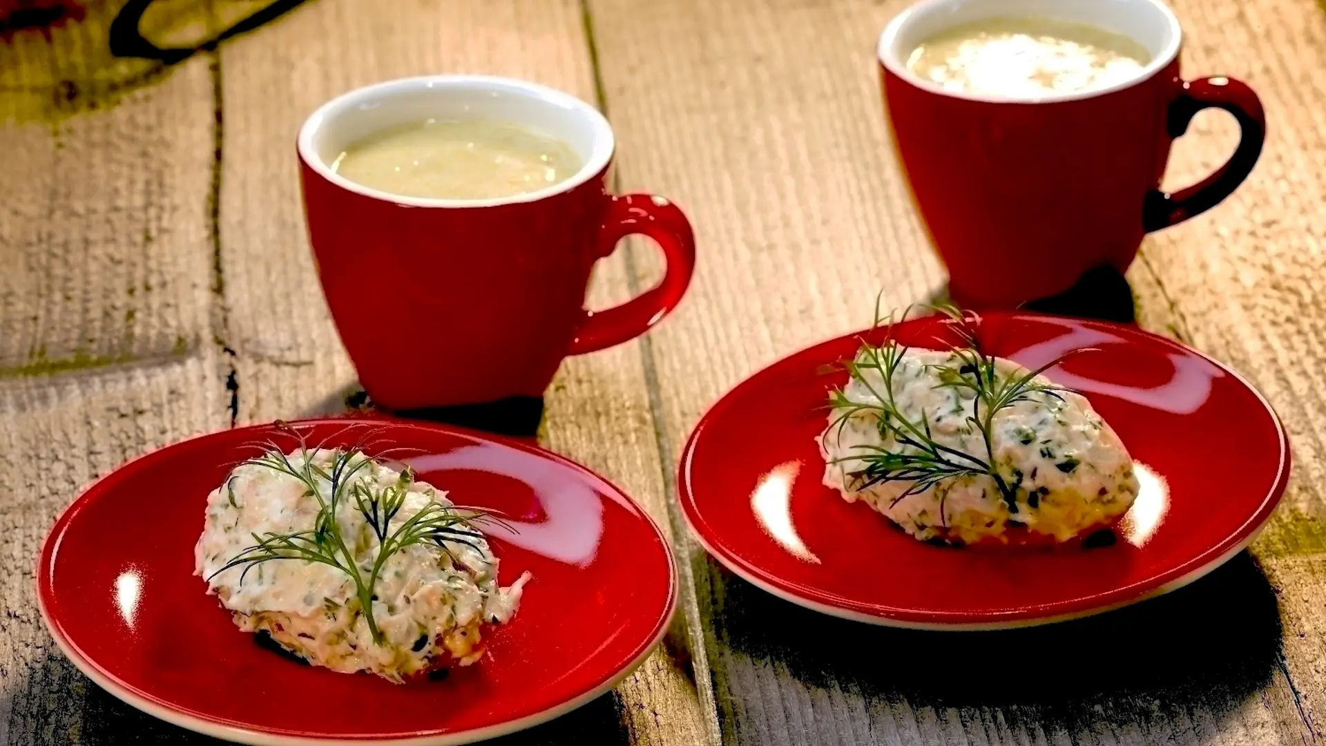 Luftig, cremet porresuppe med bold af varmrøget laks og krydderurter