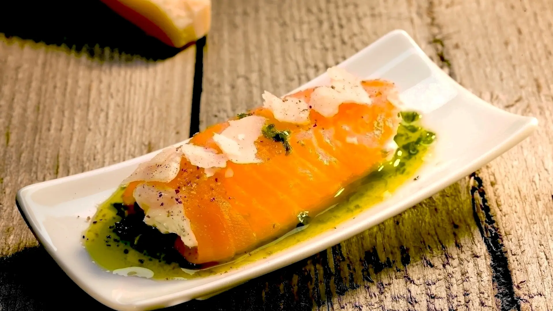 Lakserullerne anrettes med lidt krydderurteolie rundt om, og drysses med Grana Padano i flager.