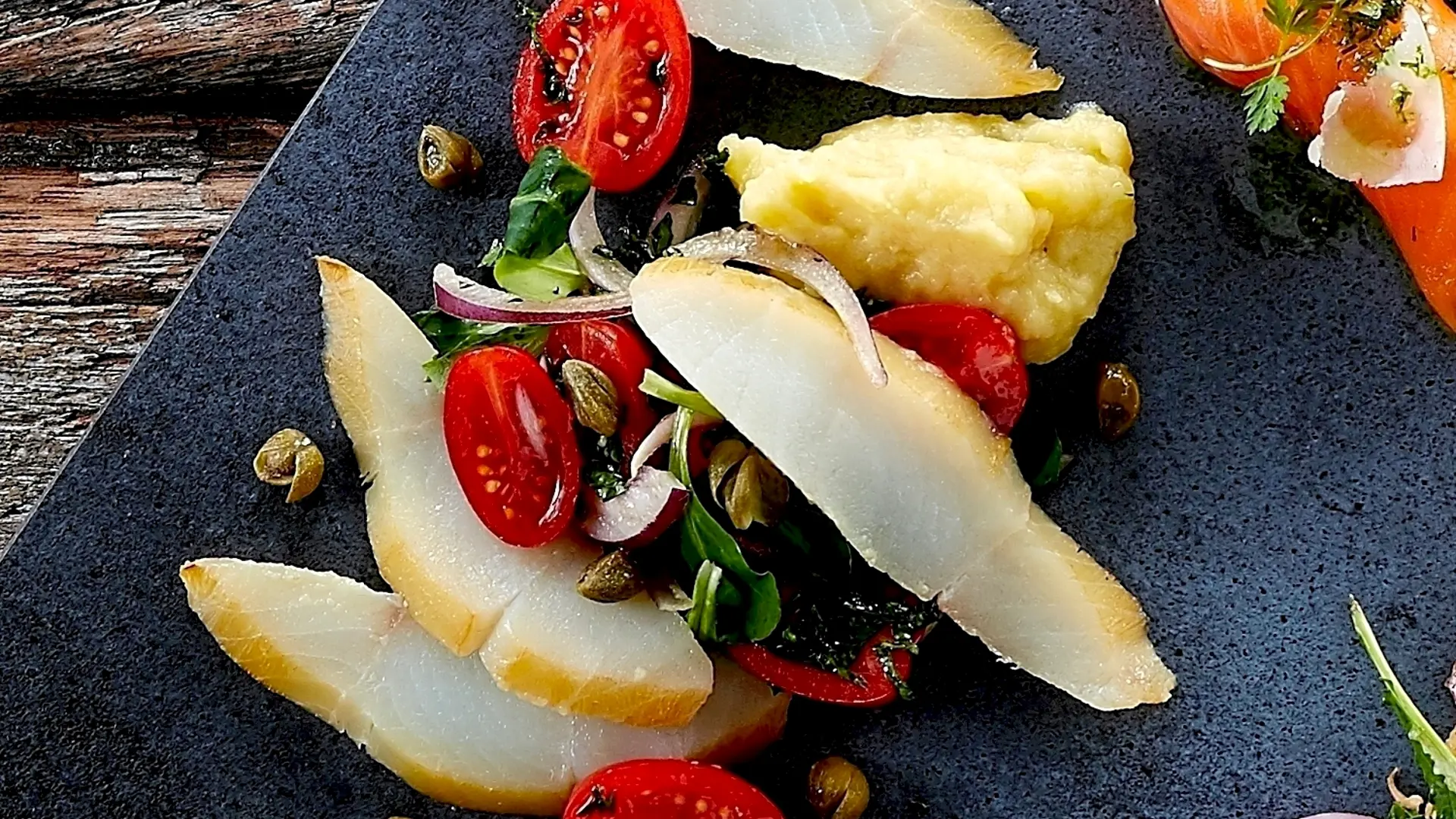 Røget hellefisk på tomatragout med stegt æblepure, kapers og feldsalat