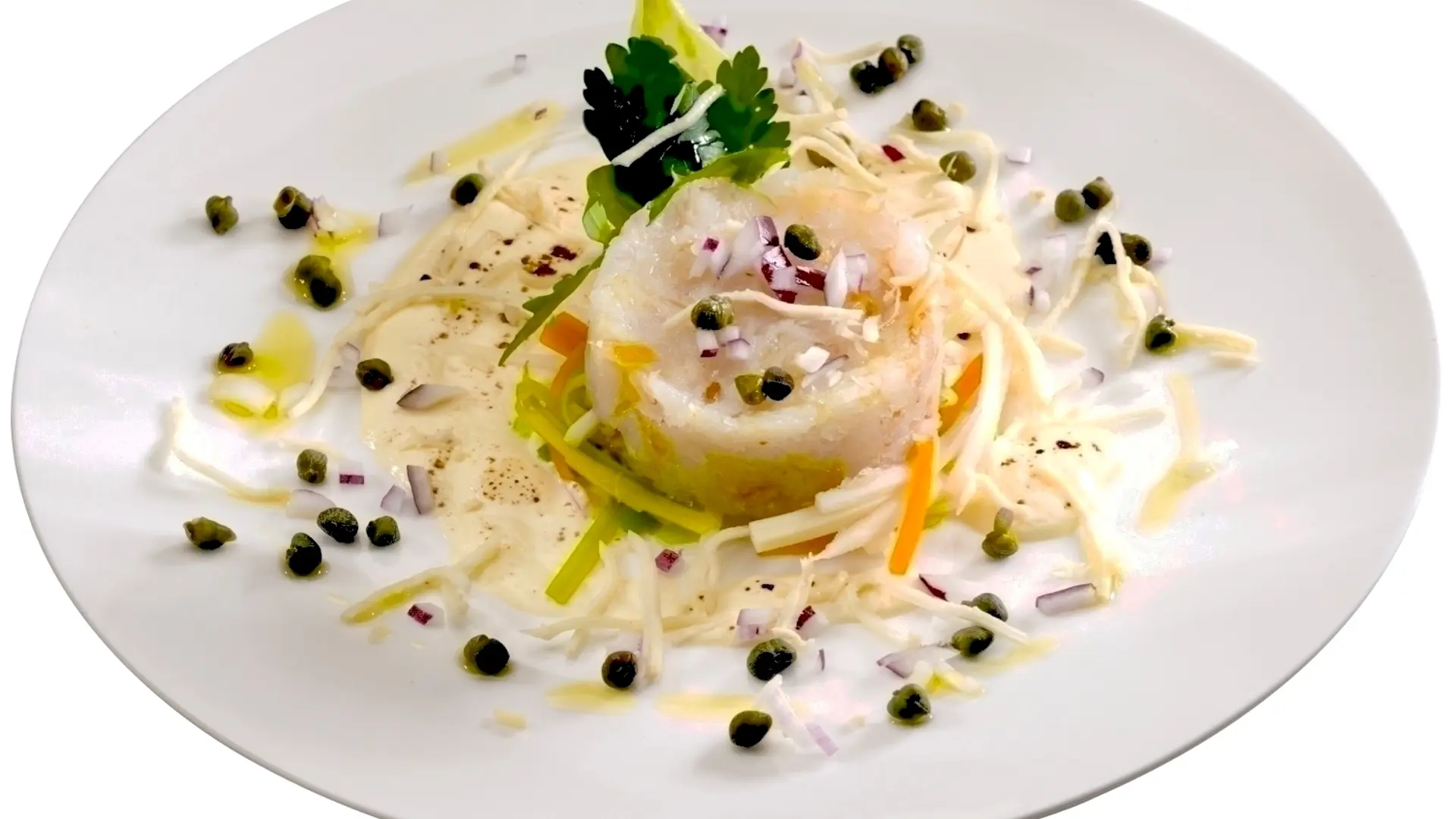 Røget hellefisktatar i rede af møre grønsager på gratineret gorgonzolacreme