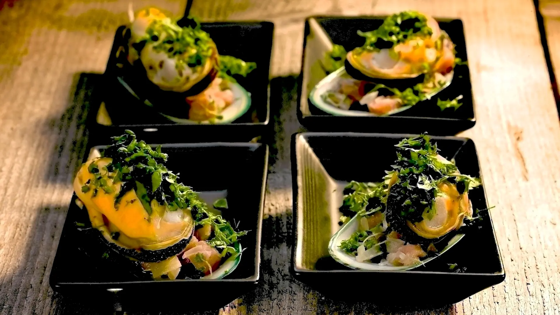 Sammenkomst af karse og løg blander sig med duet af grønne muslinger og hakket røget tun