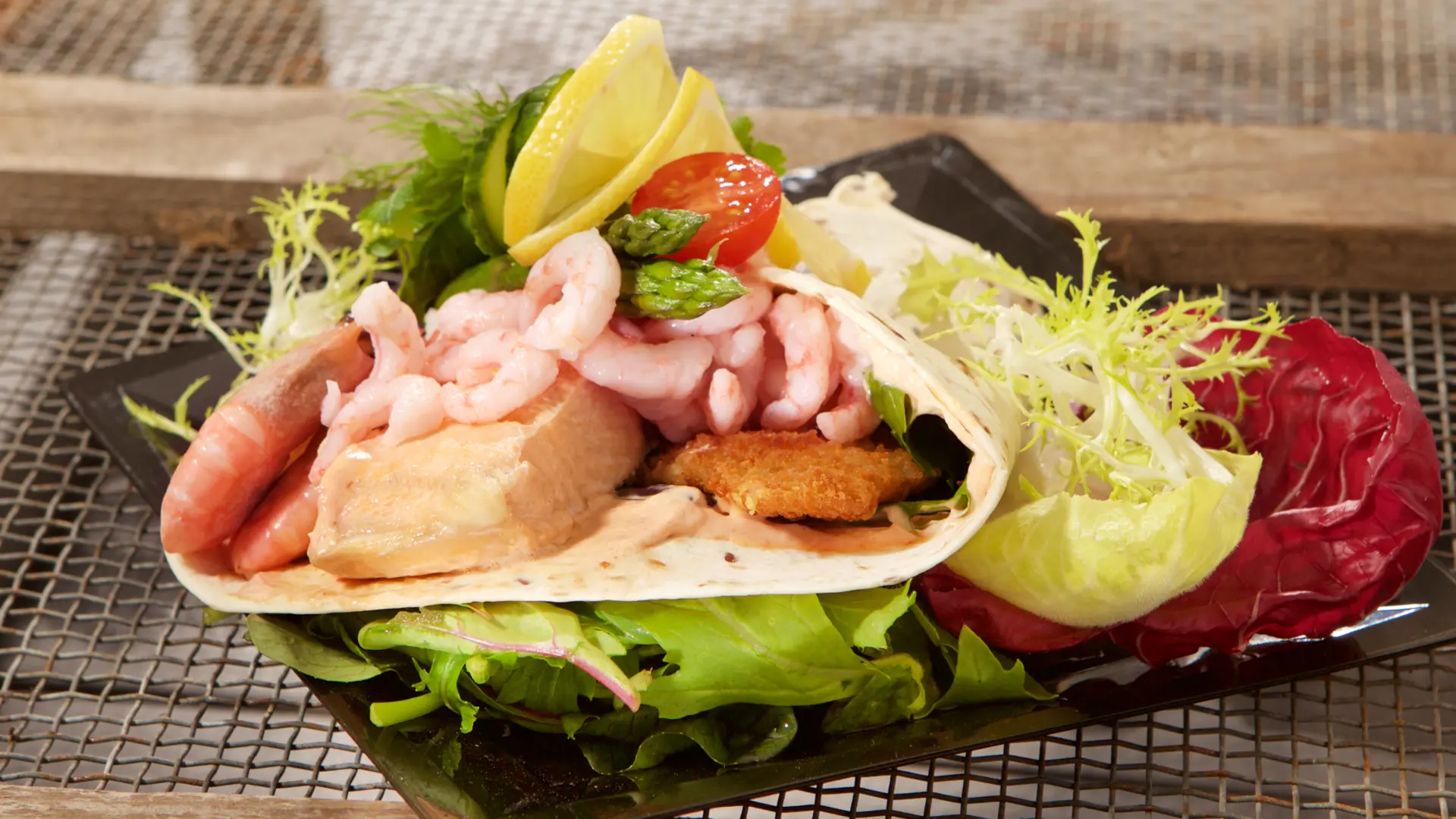 Fordel dressingen og rejerne og luk pandekagen sammen som en wrap og pynt den med citron, tomat og agurk.