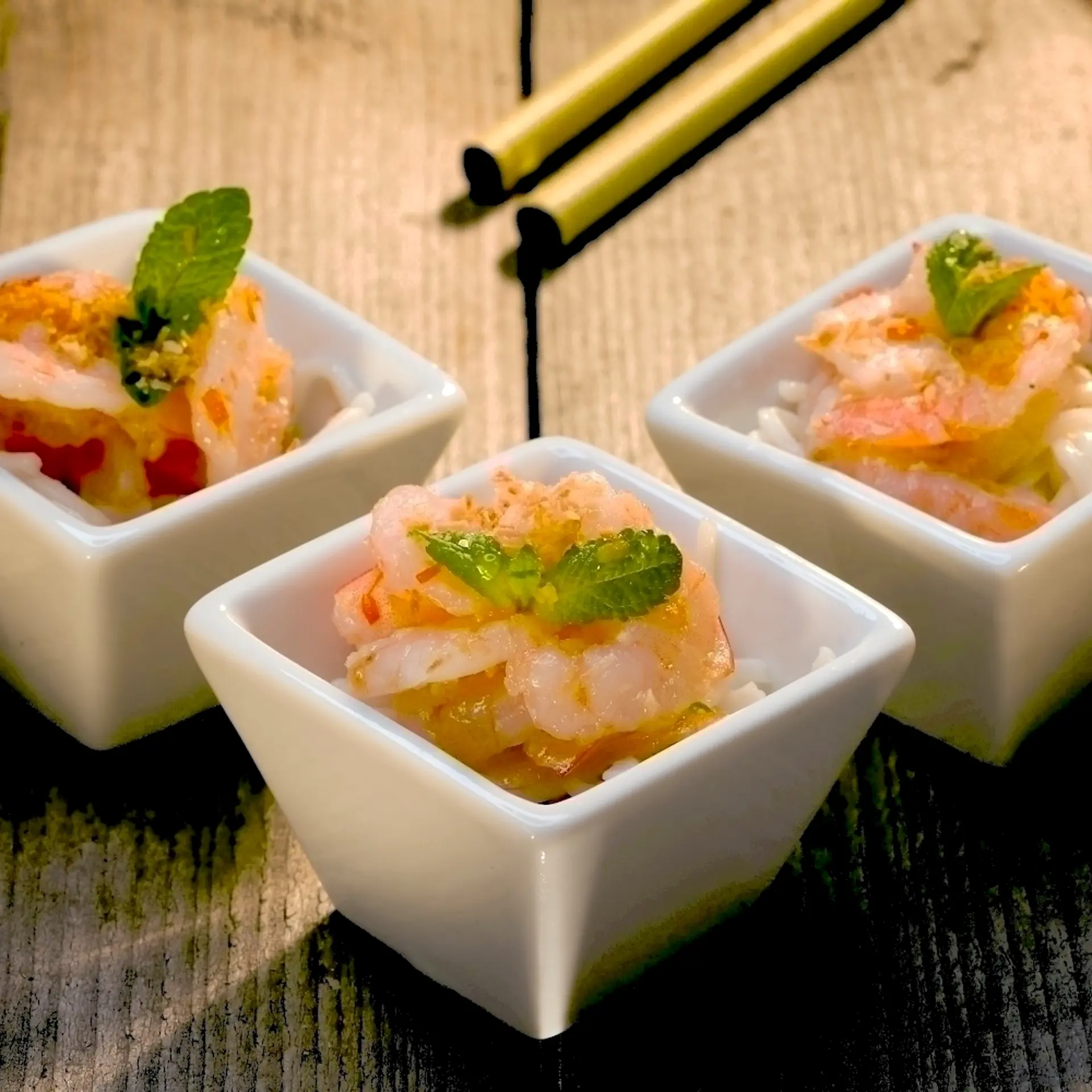 Black tiger-rejer syltet i honning, chili og ristet kokos på salat af æggenudler