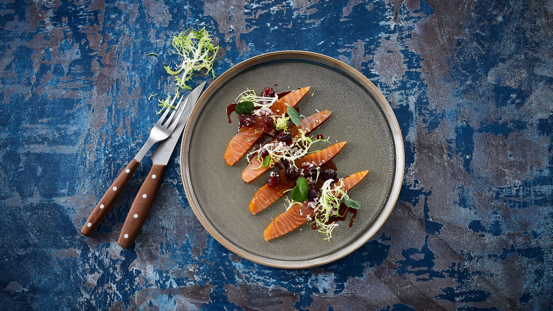 Stykker af koldrøget laks med karamelliserede tranebær, peberrod og et strejf af whisky