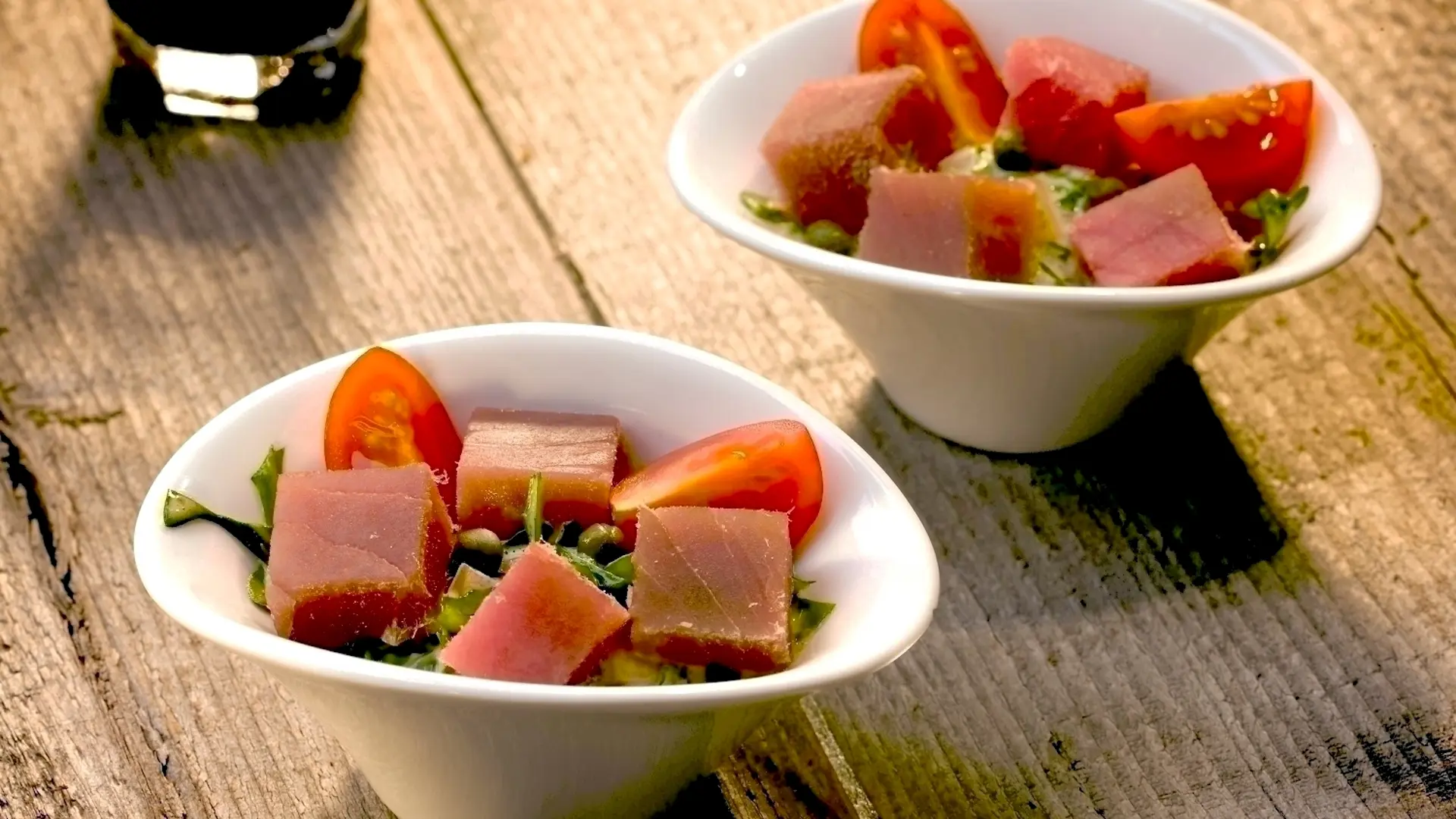 Tern af røget tun på tomat og rucola bundet sammen af kapersaioli