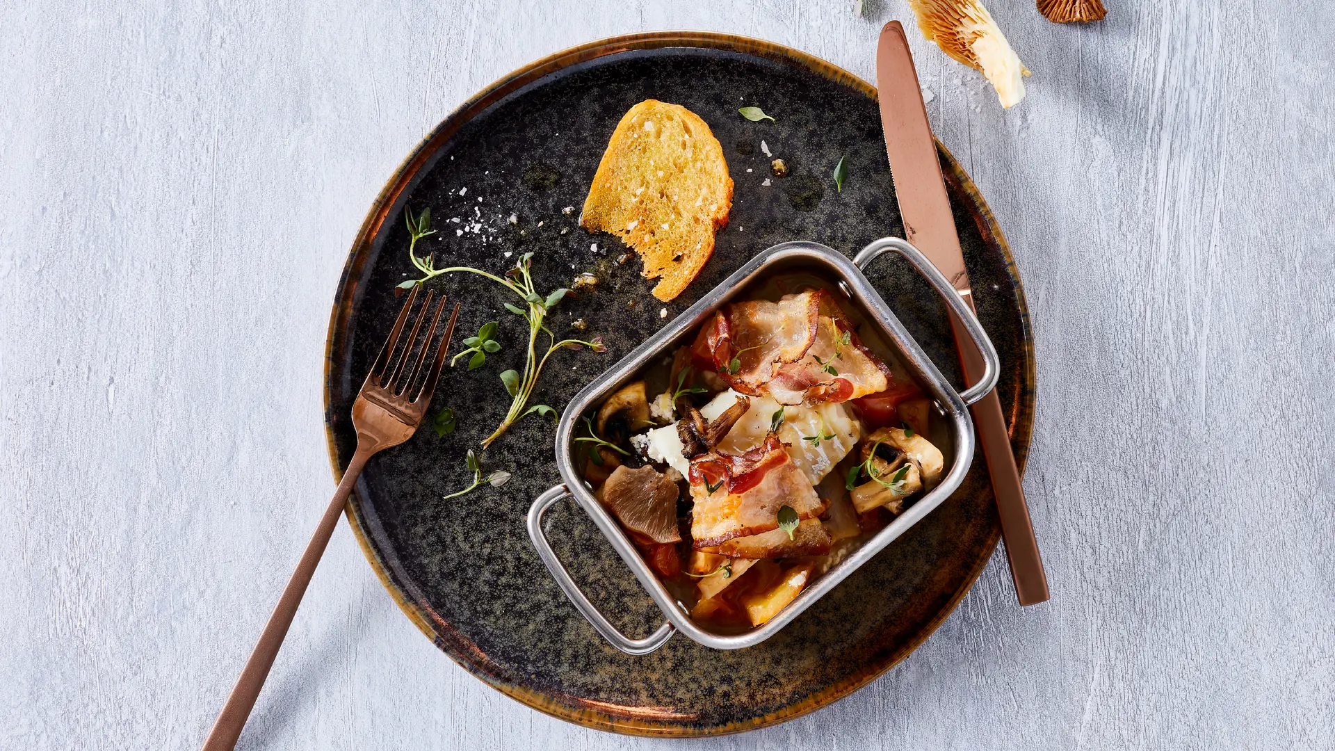 Bagt torskefilet i pande med tomat, svampe, aubergine og ricotta, toppet med pancetta