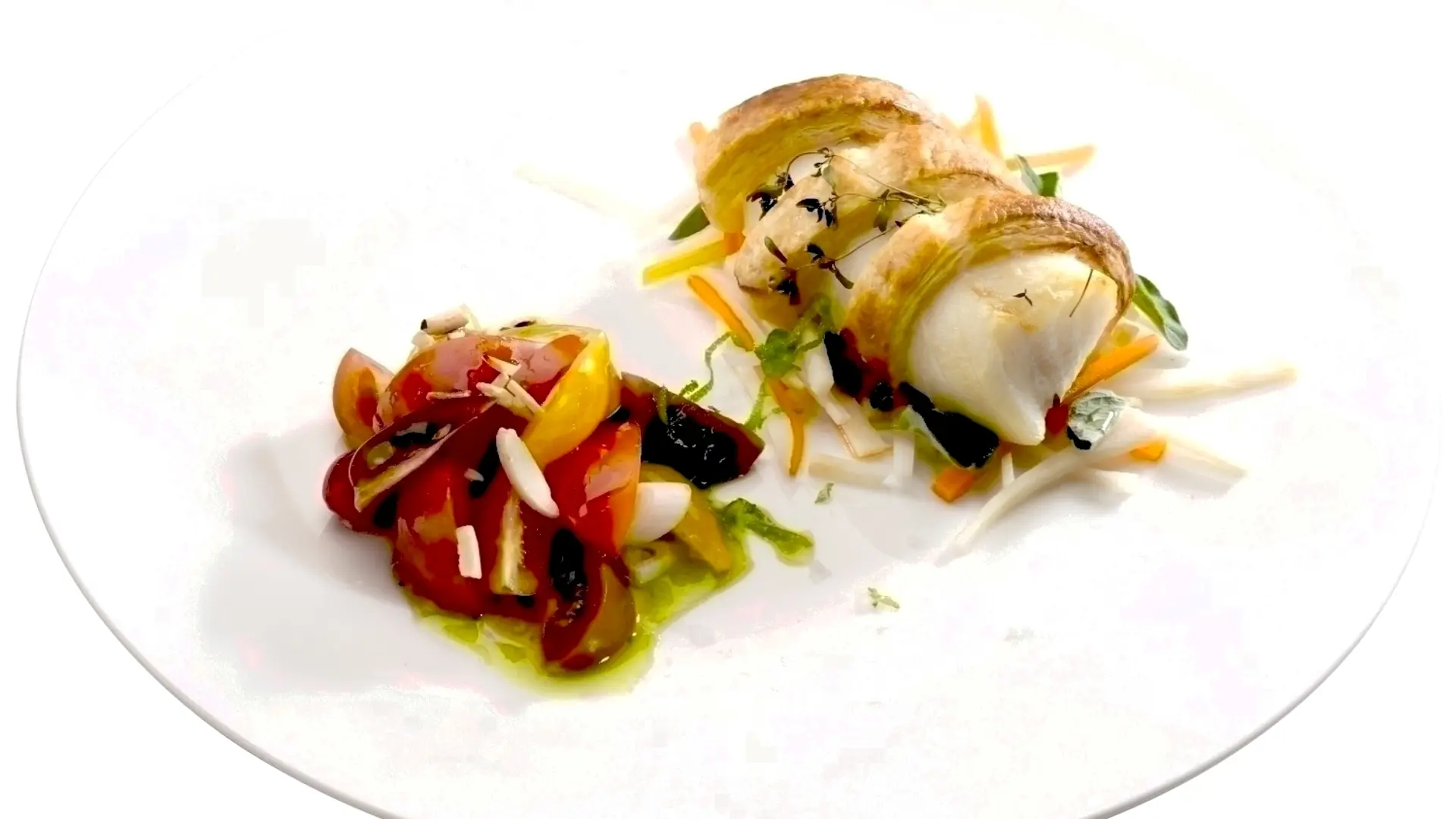 Bagt torskeloin med butterdejsbånd på multifarvet tomatsalat