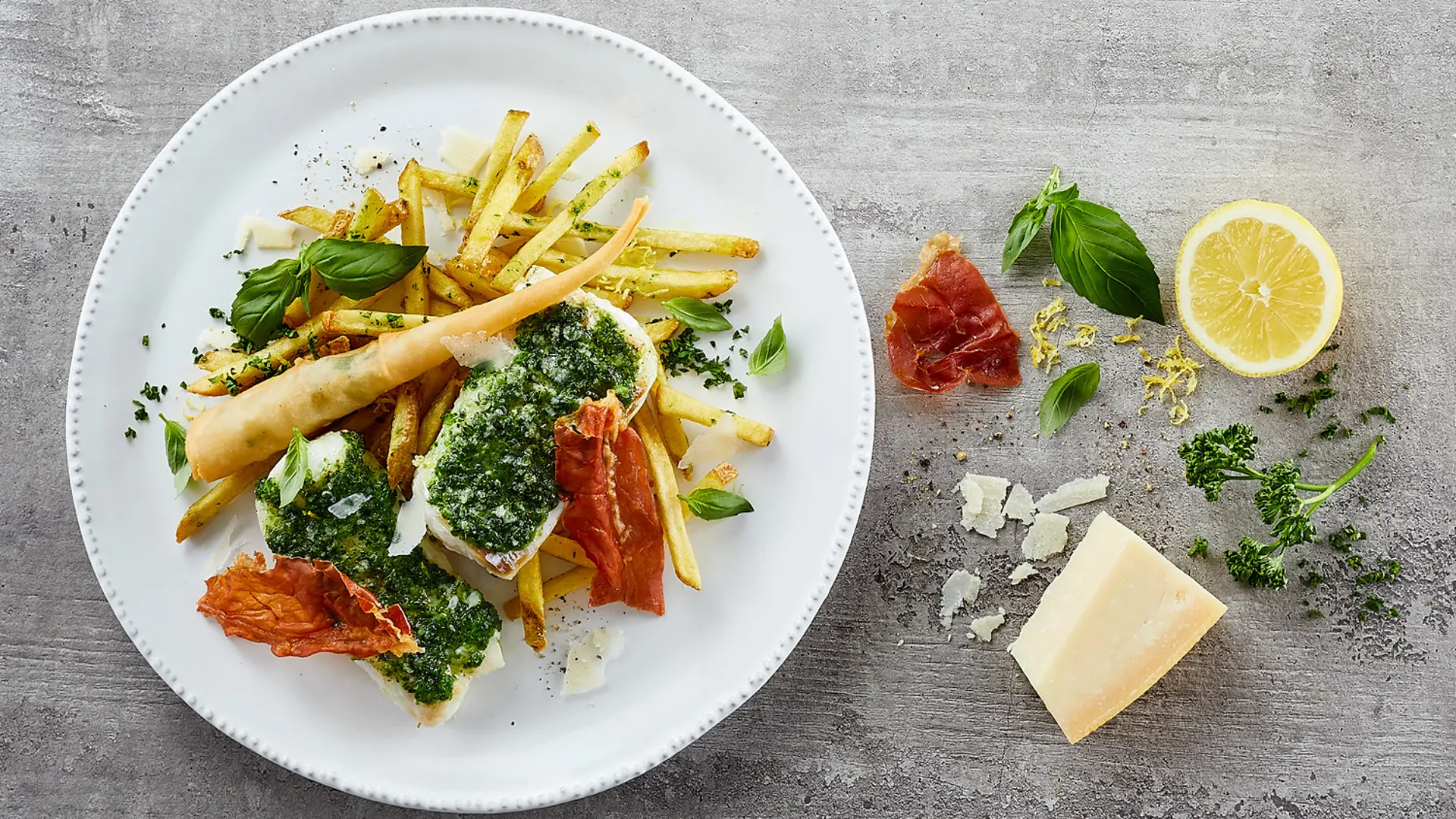 Polar Torskeloins med persillepesto ovnbages og serveres med tynde pommes frites, der også er vendt i pesto, flager af frisk parmesan og skiver af bagt serranoskinke. Drys med et mix af hakkede krydderurter og revet citronskal med en Polar Reje Twister på toppen.