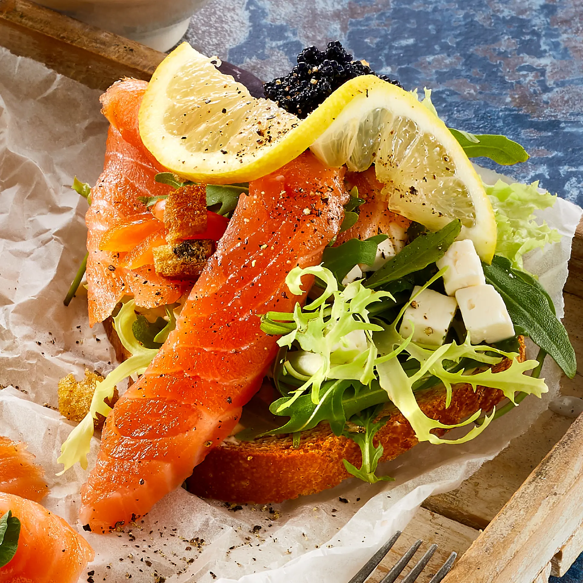 Rimmet og koldrøget laks med rucola, feta, rogn og brødcroutoner