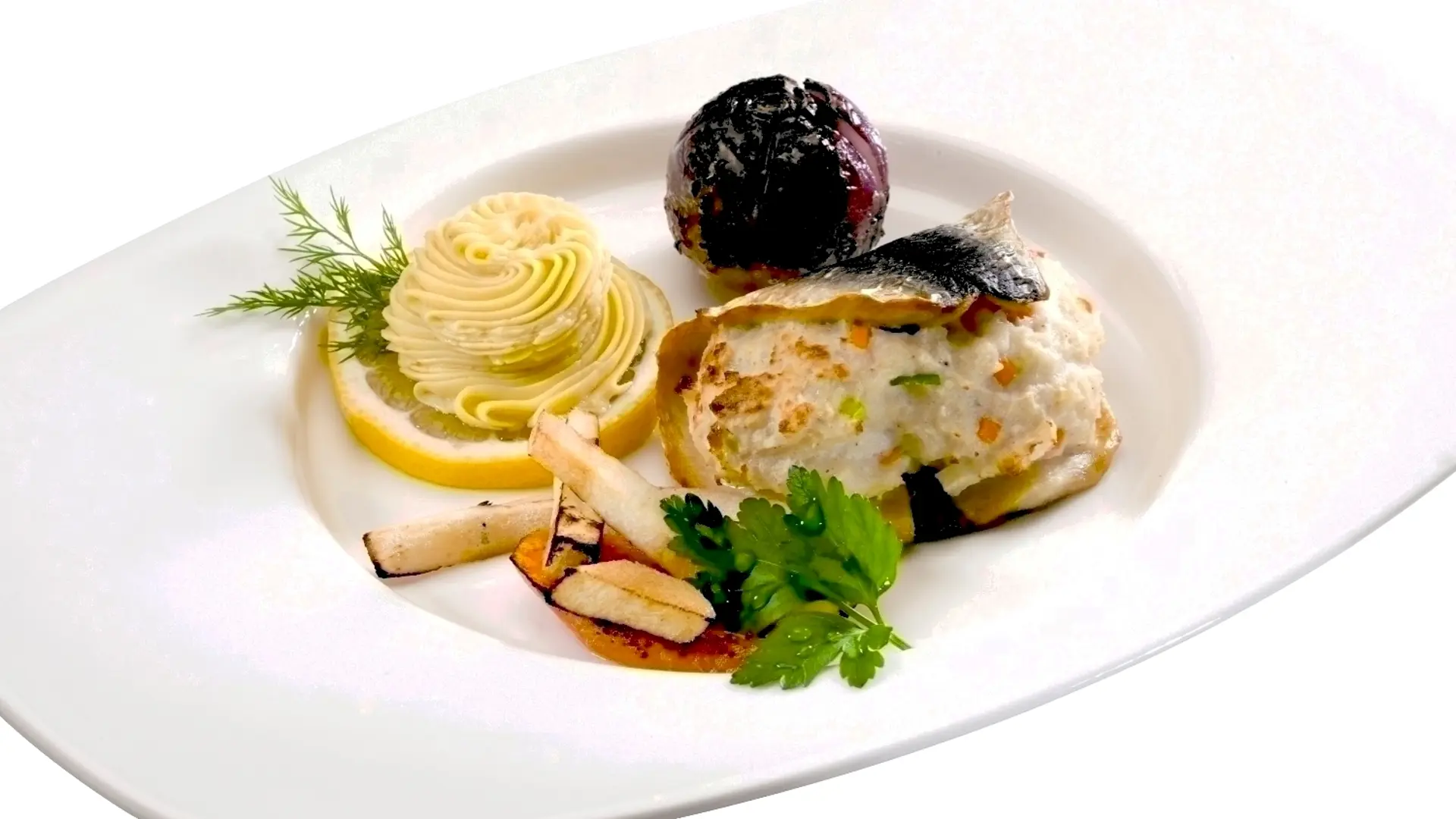 Grønsagsfarseret sildefilet med sennepssmør