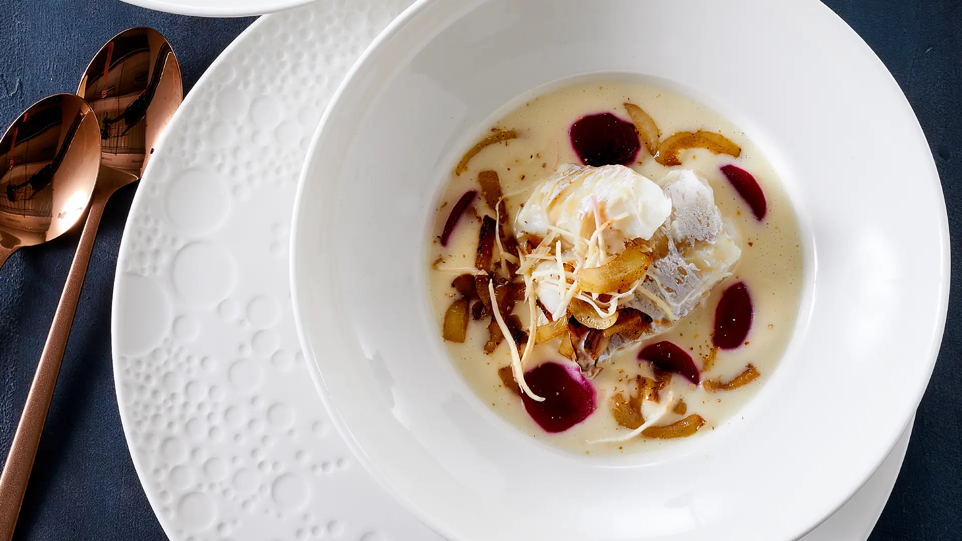 Peberrodssuppe med kogt torsk, lynsyltede rødbeder og bløde løg