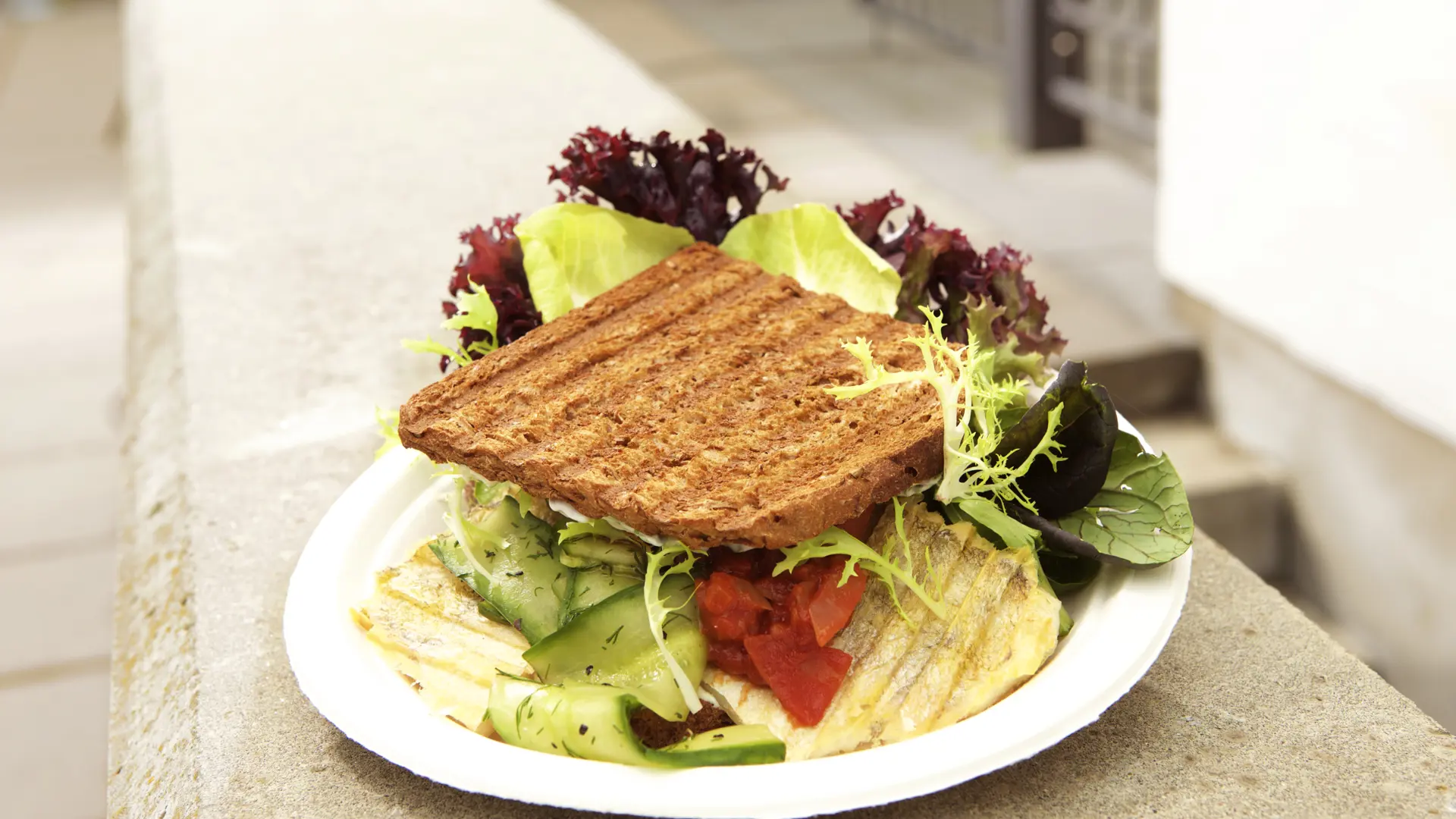 Sandwich med grillet sandart, tomatrelish og agurkesalat