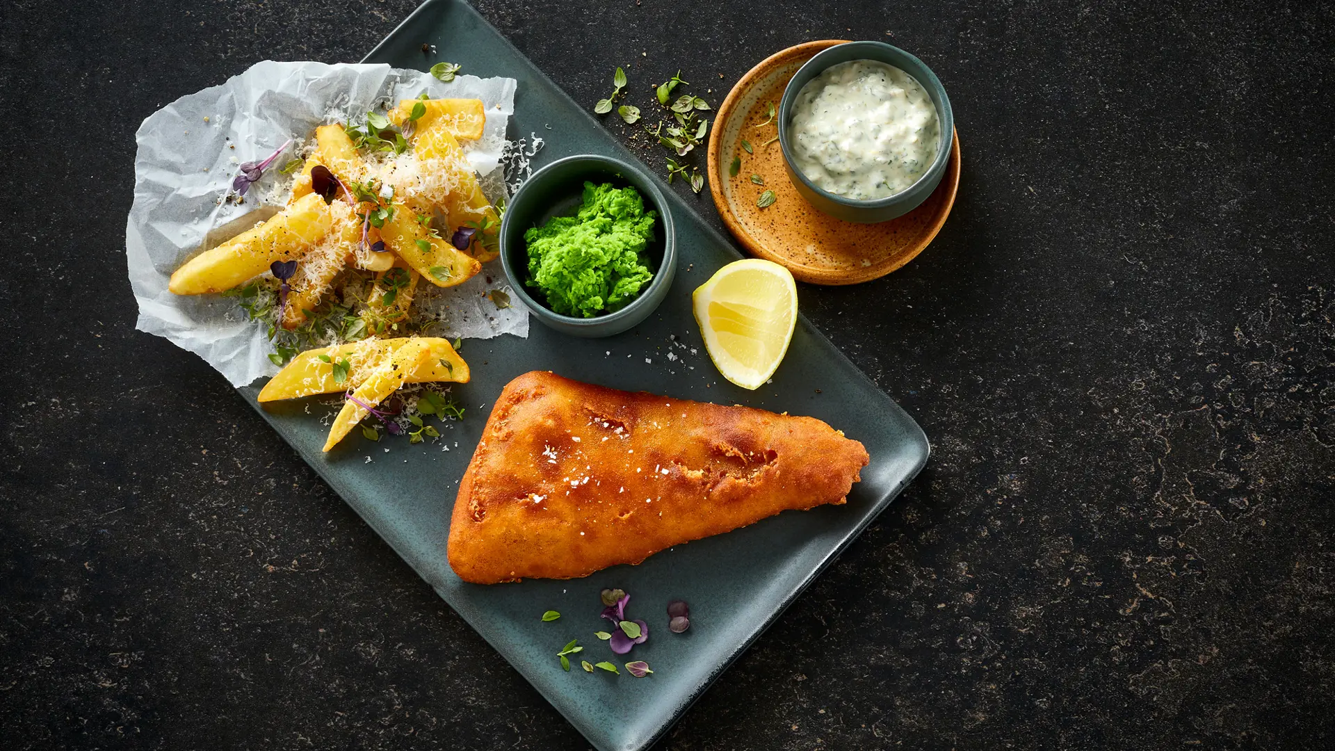 Fish and Chips med mynte moste ærter og tatarsauce