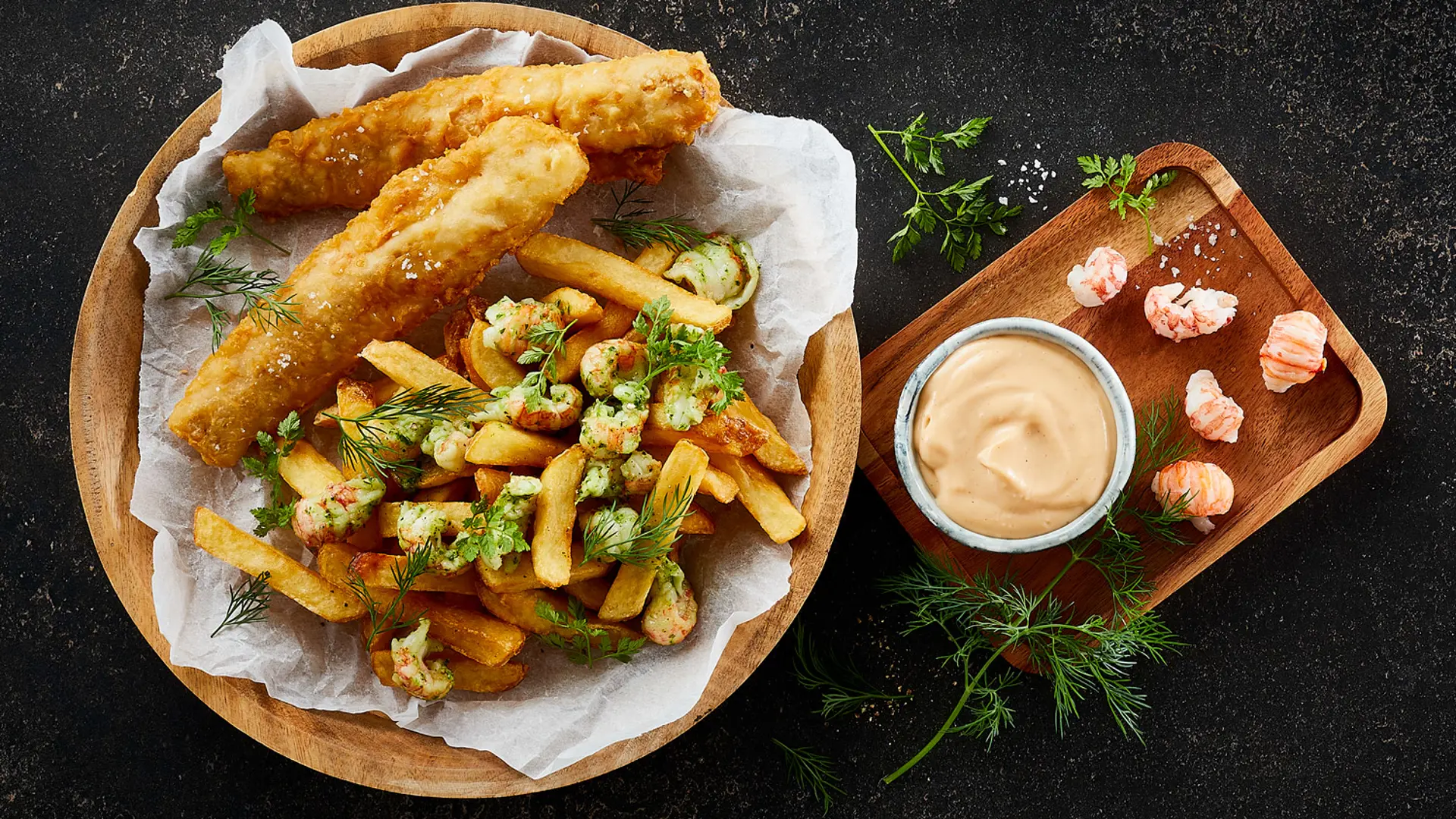 Vi har vendt vores Polar Alaska Sejfilet i en tempuradej, der giver en lækker sprødhed. Serveres her med pommes frites, hummermayo og stykker af jomfruhummer vendt i urteolie og pyntet med dild og kørvel på toppen.