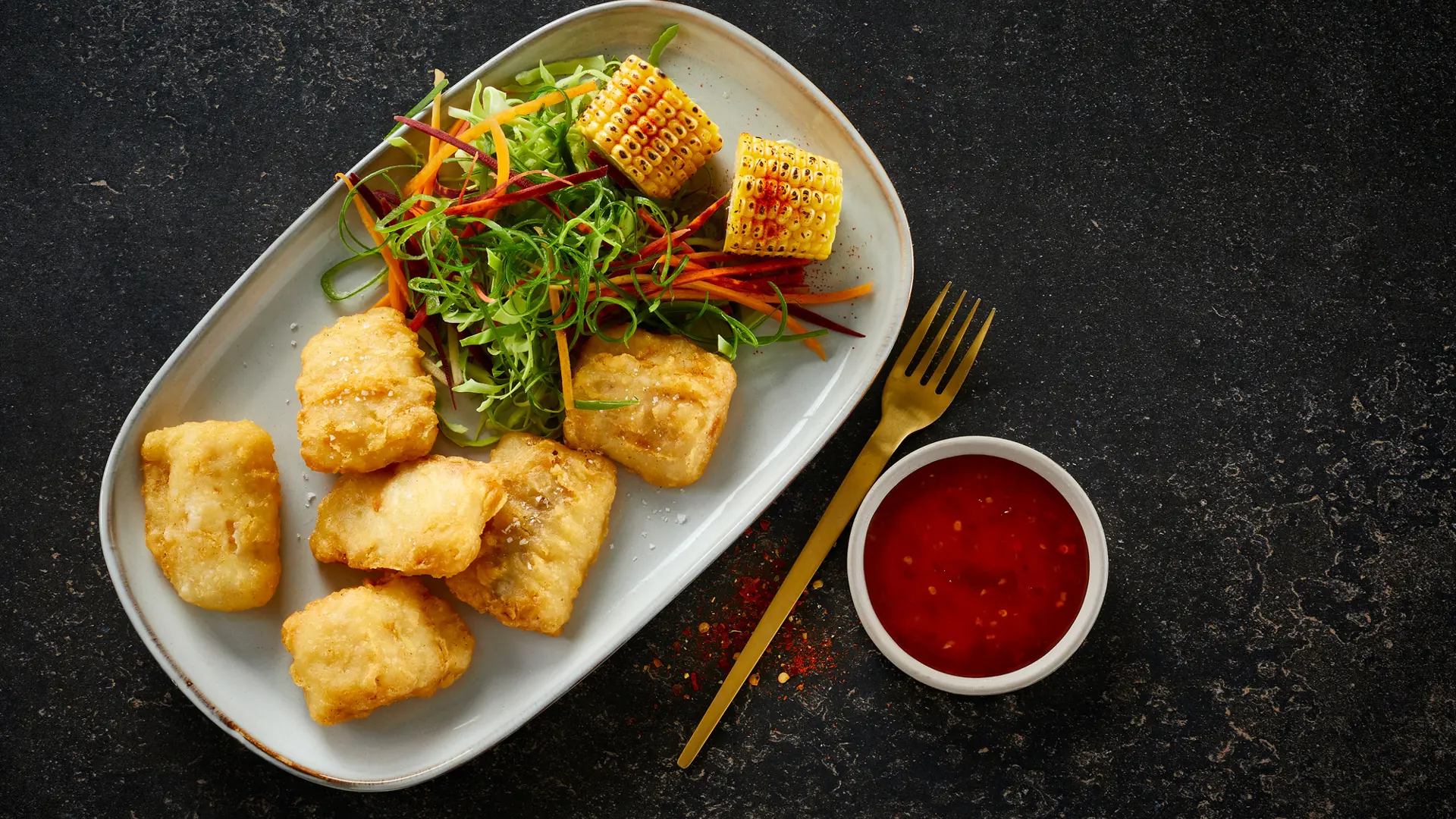 Server de sprøde nuggets med salaten og sweet chilisauce.