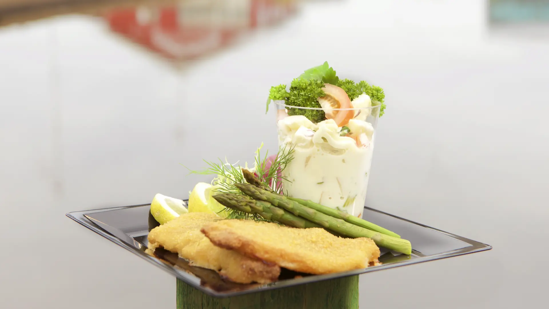 Rør mayonnaise og creme fraiche sammen, og smag til med dijonsennep, salt og peber. Bland de afkølede grønsager, kartoffeltern, hakket rødløg og aspargesstykker i.