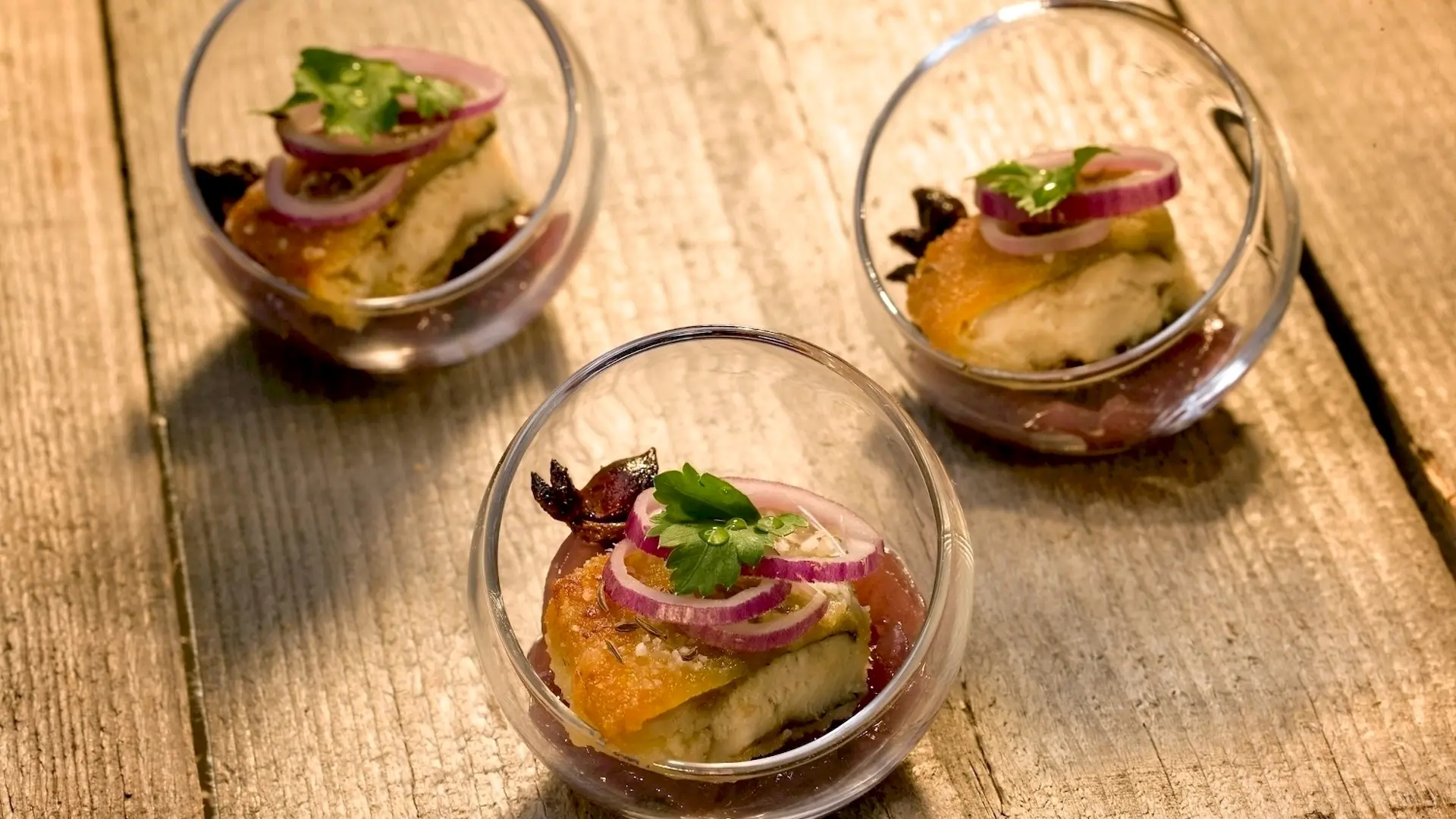 Stegt sild i lage med stødt anis på rødløgsmarmelade med lakrids og kommen