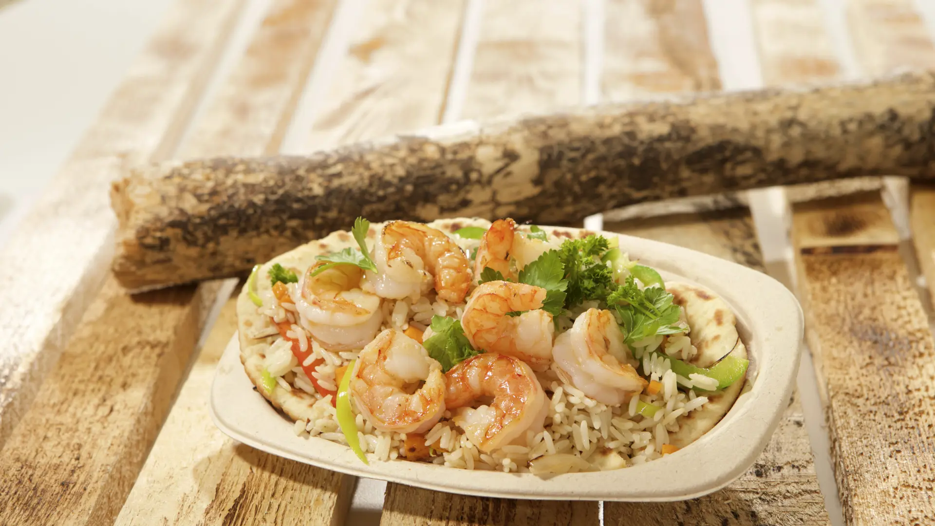 Åben laffa med stegte ris, grønsager og stegte black tiger-rejer i hvidløgsolie