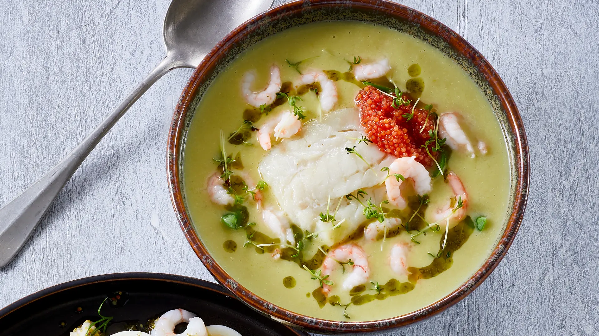 Cremet purésuppe af grønne slikasparges, håndpillede rejer, bagt sej, stenbiderrogn og lime-/krydderurteolie