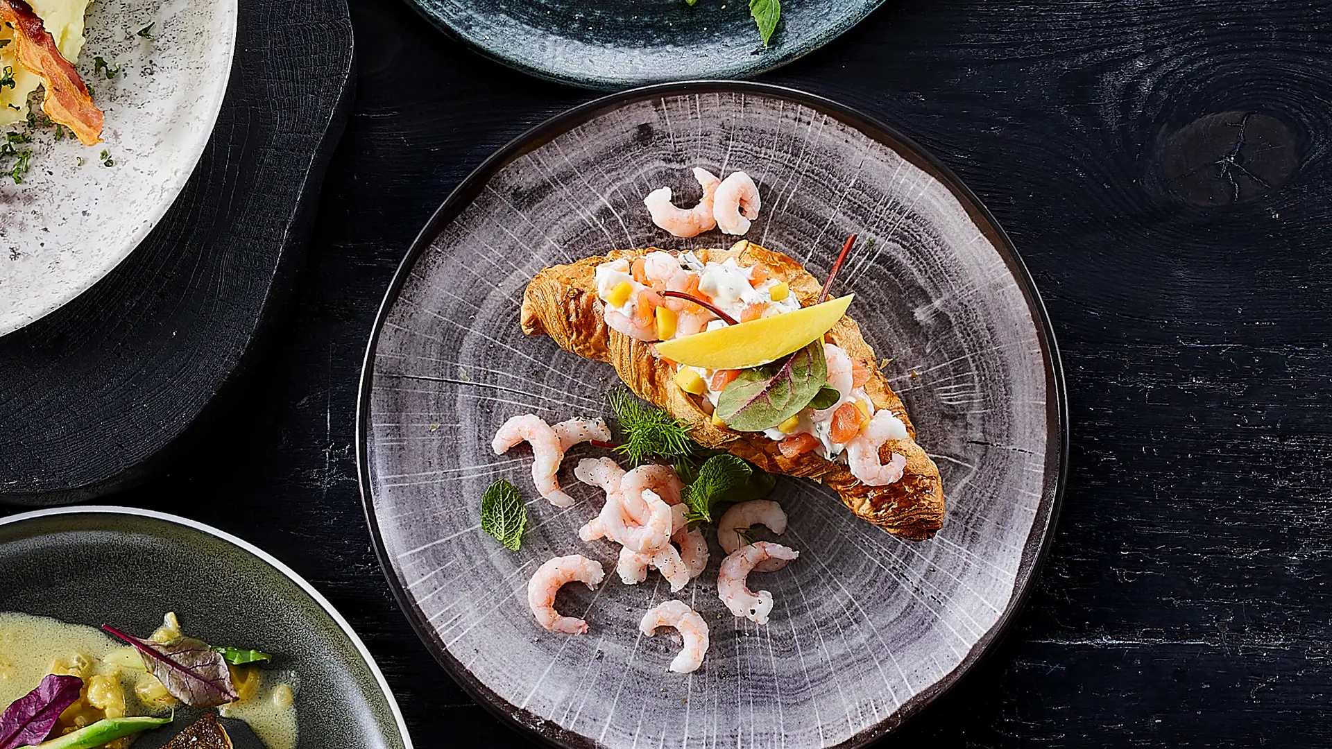 Croissant med mango-/rejesalat og tern af koldrøget laks