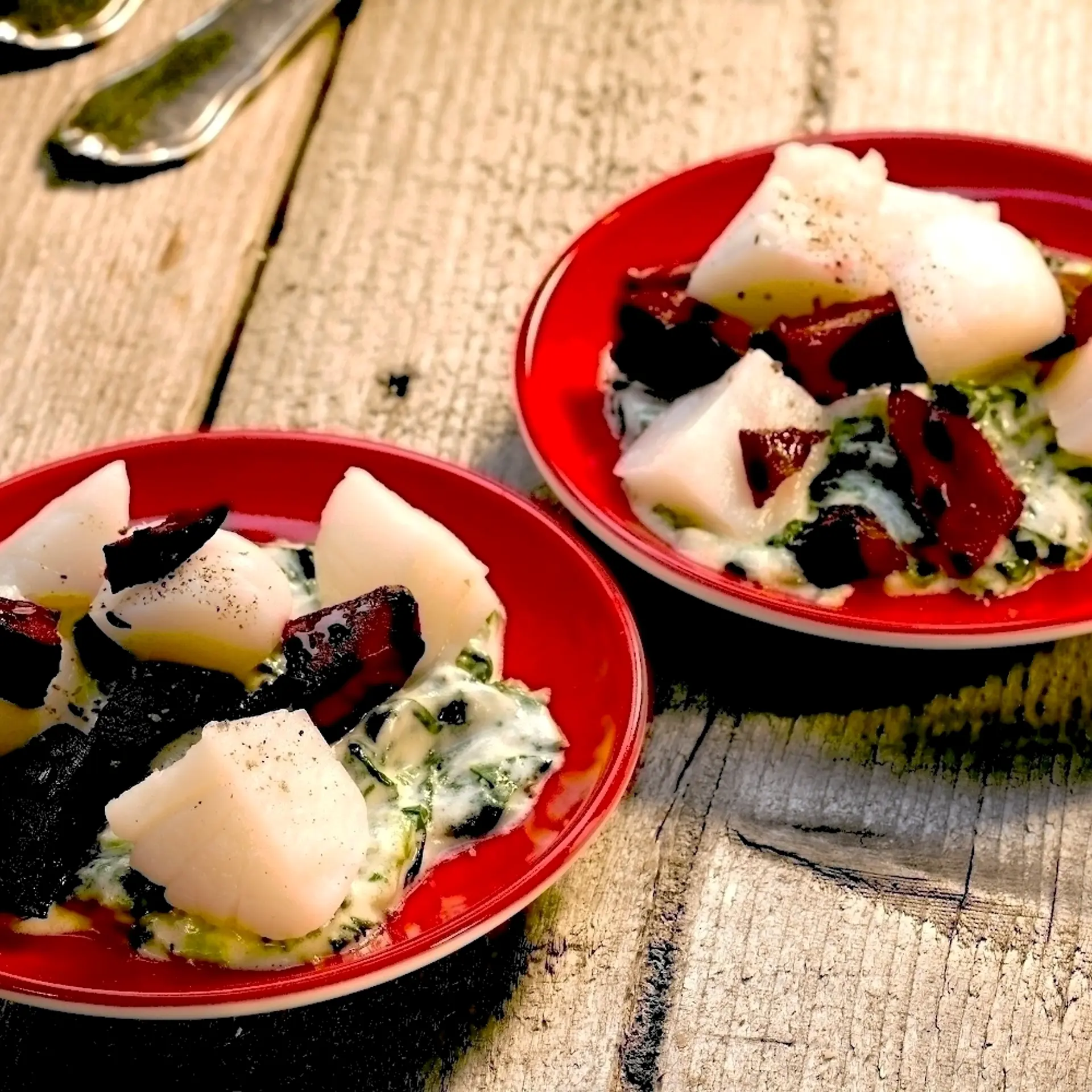 Kammuslinger og bagte rødbeder gør hinanden selskab på spinatcreme