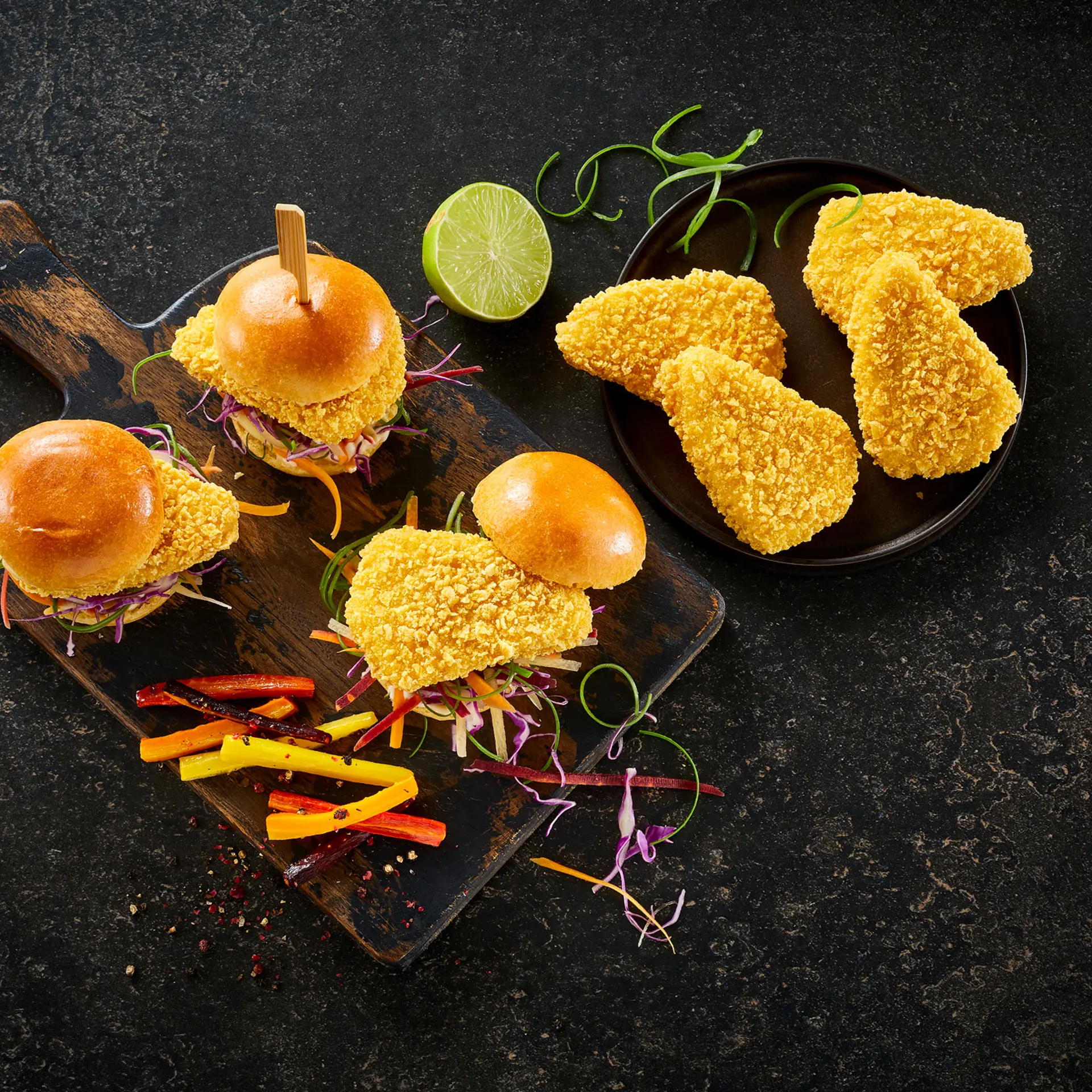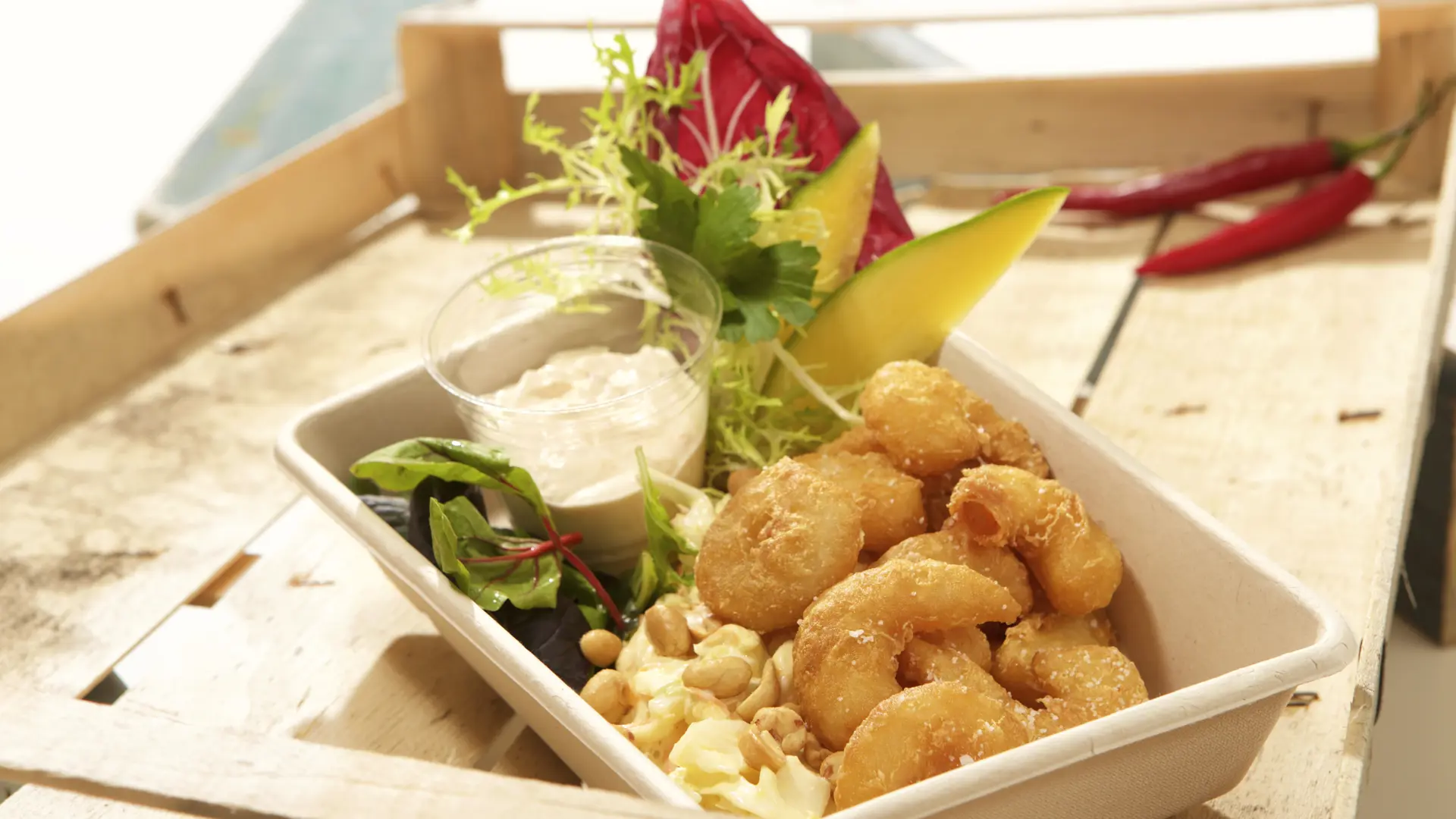 Indbagte rejer på salat af spidskål, mango og peanuts med ingefærdip