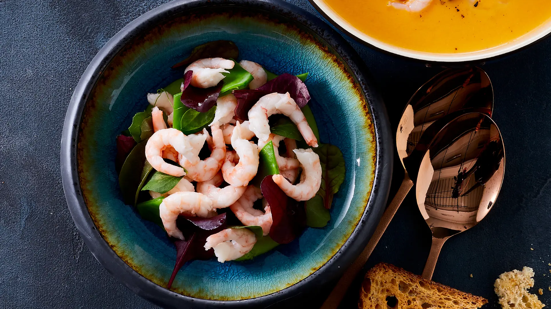 Koldtvandsrejer på leje af fantasi af grønne ærter og syrlige salater