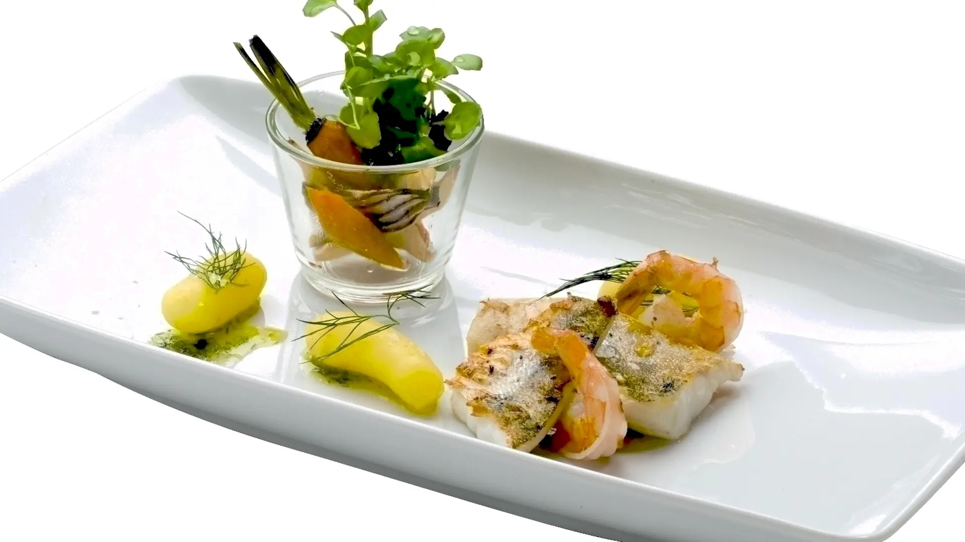 Når fisken er færdig, lægges den op på et fad og krydres med salt og peber (her kan der med fordel bruges flagesalt og groft peber). Medens fisken trækker lidt, steges/ grilles varmtvandsrejerne på panden, hvorefter de kommes over fisken.