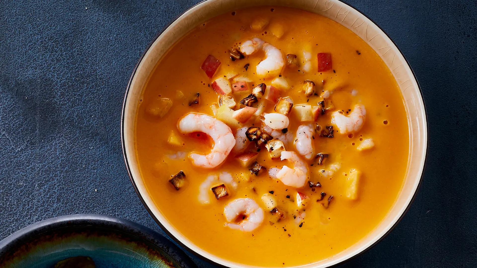 Suppe af skaldyr og purerede pastinakker med rejer, brændt selleri og friske æbler