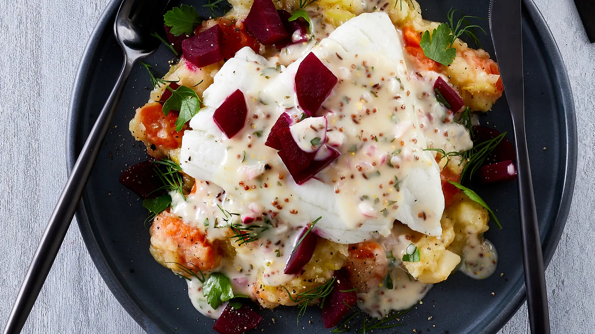 Dampet rødspættefilet i rustik senneps-/ persillesauce med kartoffellabskovs og rødbeder