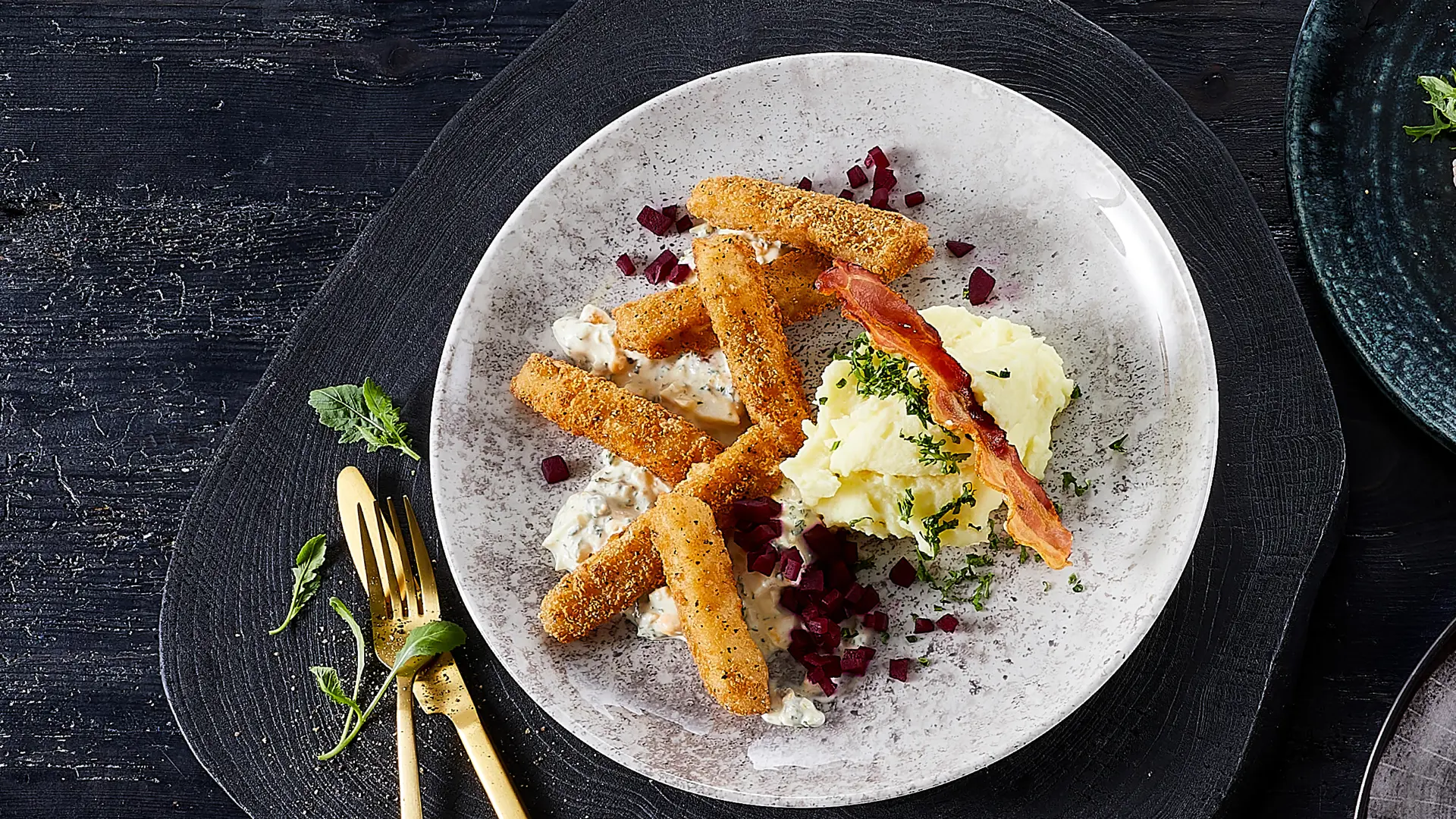 Ising-Goujons med kartoffelmos, kaperssalat og sprød bacon