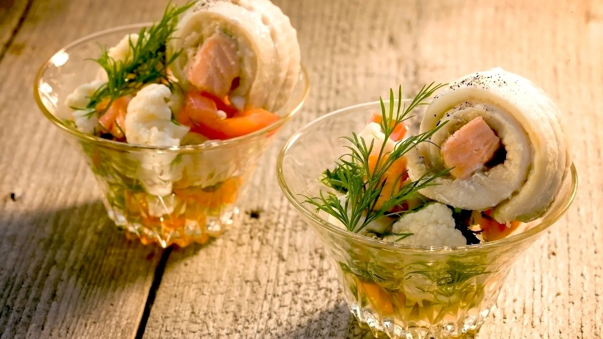 Kold dampet isingroulade med laks på leje af sprød blomkålssalat