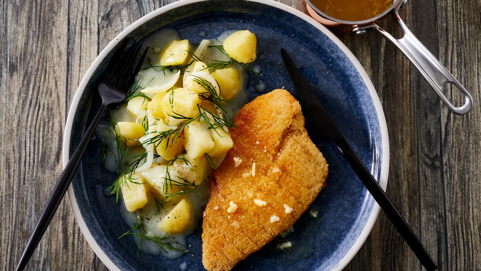 Læs opskrift : Stegte rødspættefileter med varm kartoffelsalat med strejf af citron, overflod af dild og flydende hvidløgssmør