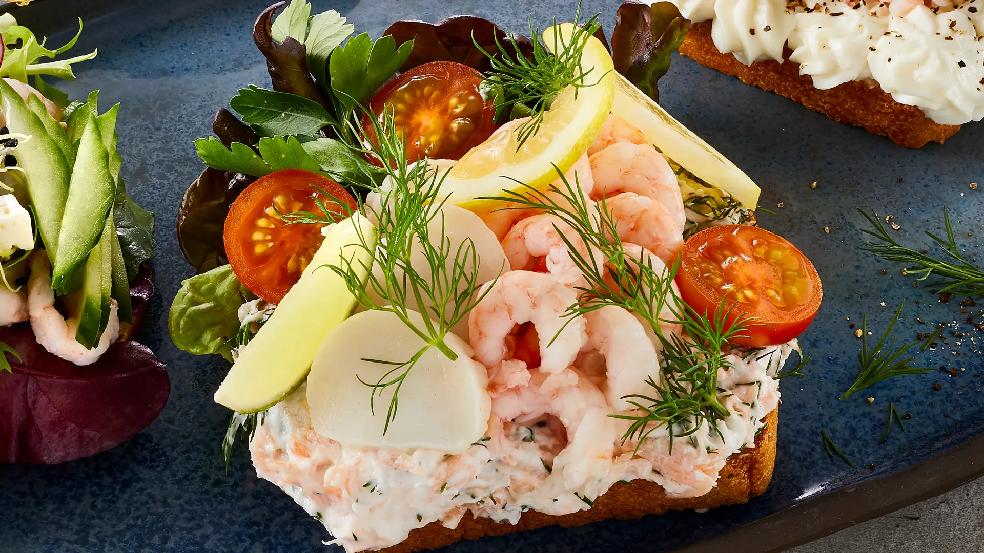 På en skive ristet franskbrød med pyntesalat kommes en flink portion af laksesalaten. Herudover drysses håndpillede rejer, og skiverne af kammusling lægges i en pæn række herpå.