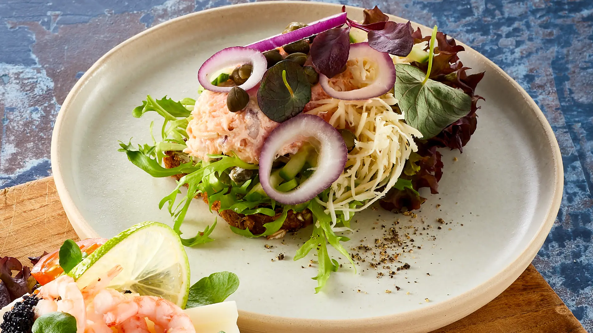 Pynt: Salatblade, kapers, peberrod, skiver af rødløg, agurk og krydderurter.