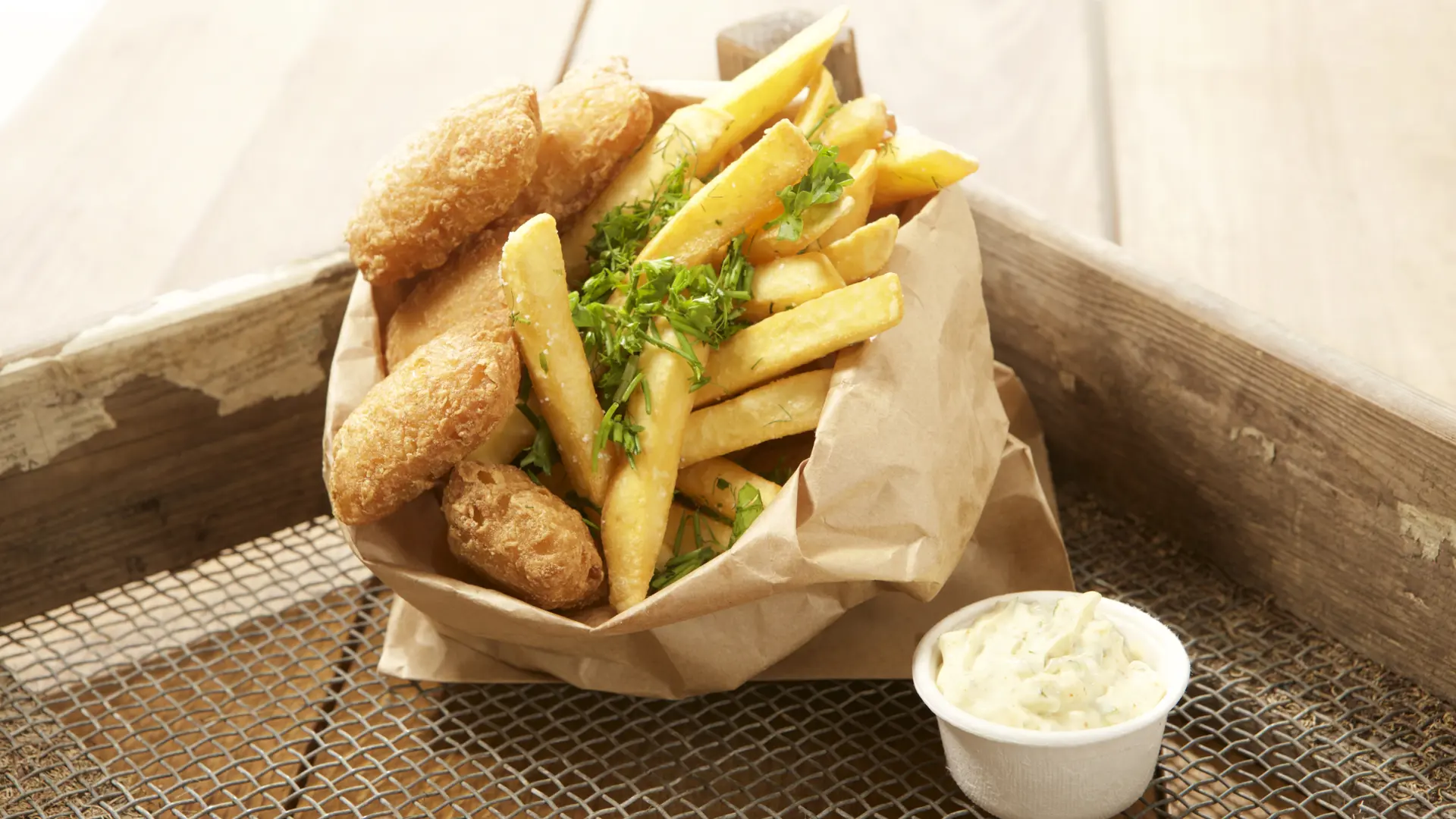 Kulmulenuggets med pommes frites i krydderurter og mild chiliremoulade