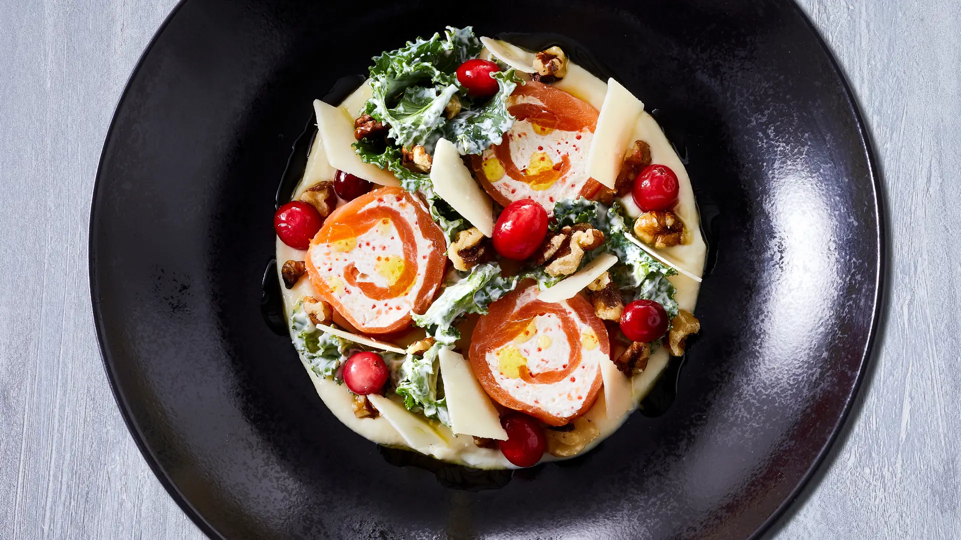 Lakseroulade med frisk grønkål, tranebær og valnødder på leje af selleripuré