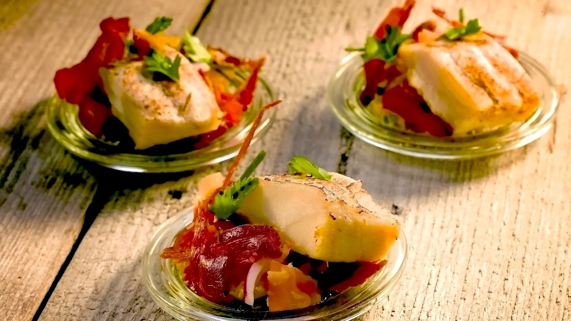 Stærk krydderbagt rødspættefilet på tomat, squash, løg og olie