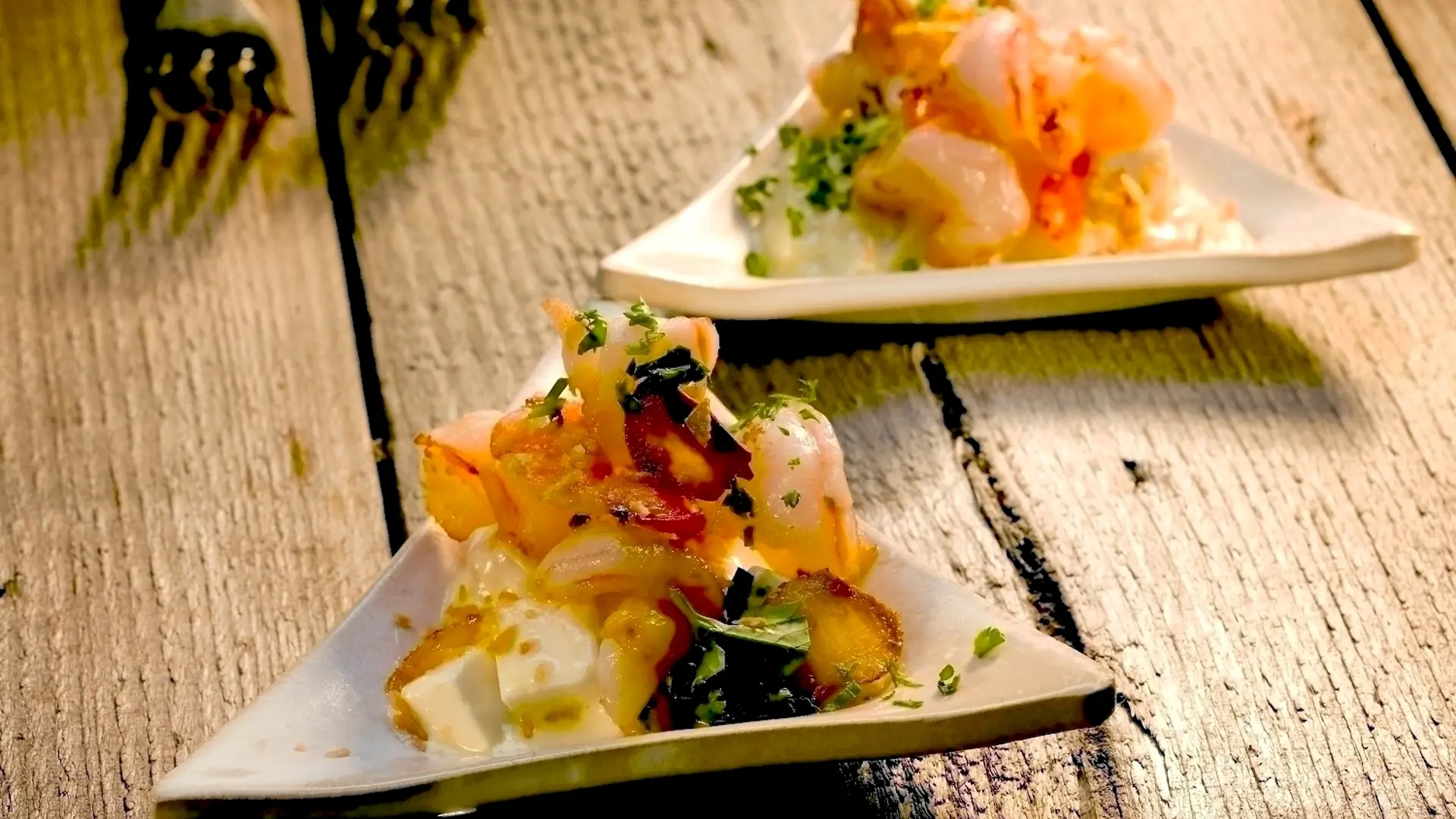 Stegte varm vandsrejer og hvidløg på cremet løgkompot med feta og ristet kokos