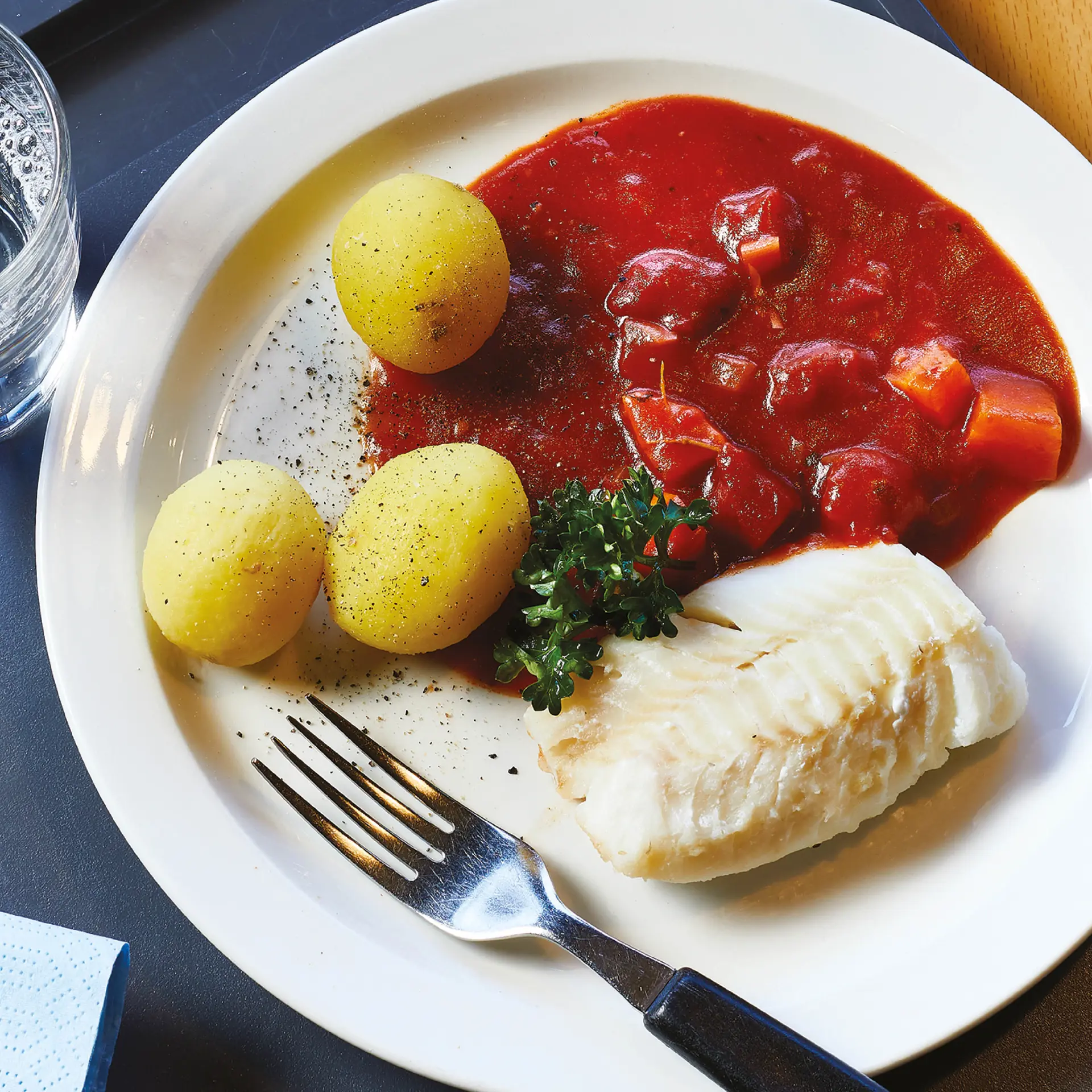 Dampet torsk med fyldig tomatsauce og kartofler