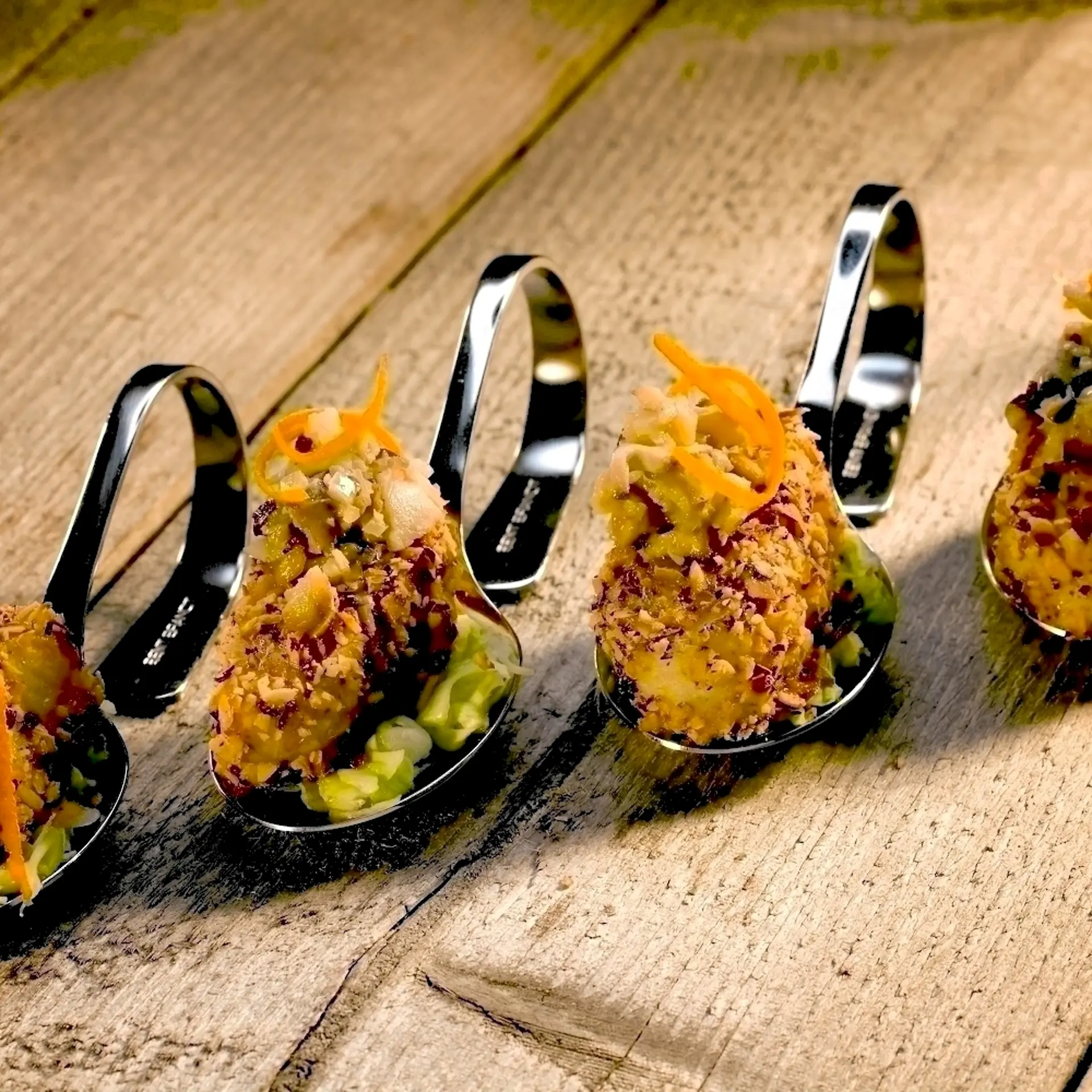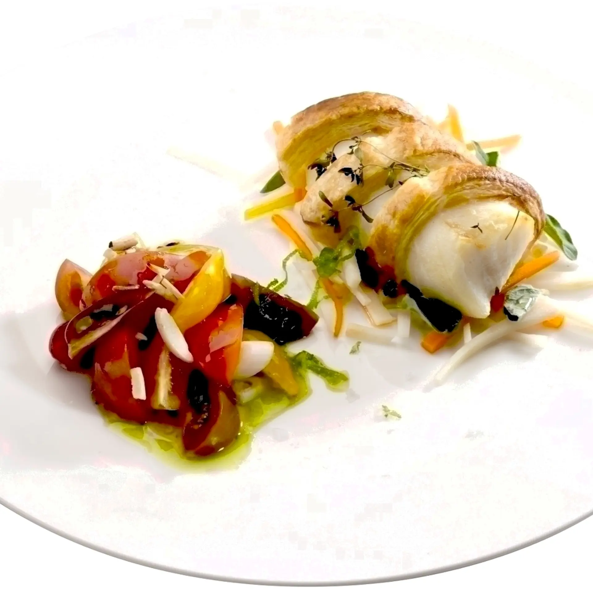 Bagt torskeloin med butterdejsbånd på multifarvet tomatsalat